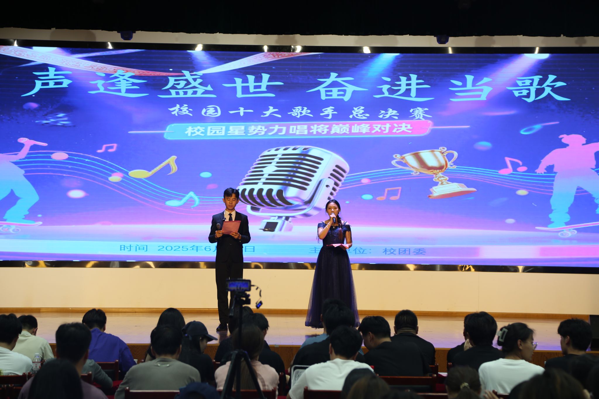 青春飞扬,歌声嘹亮。为展现新时代青年朝气蓬勃的精神风貌,丰富校园文化生活,6月10日晚7点,以“声逢盛世 奋进当歌”为主题的学校第二十一届校园十大歌手总决赛在大学生活动中心火热开唱。为打破空间界限,让青春之声传得更远,团委通过学习通平台同步直播,吸引超5000人次在线观看,以“云端盛宴”点燃全网青春热情。