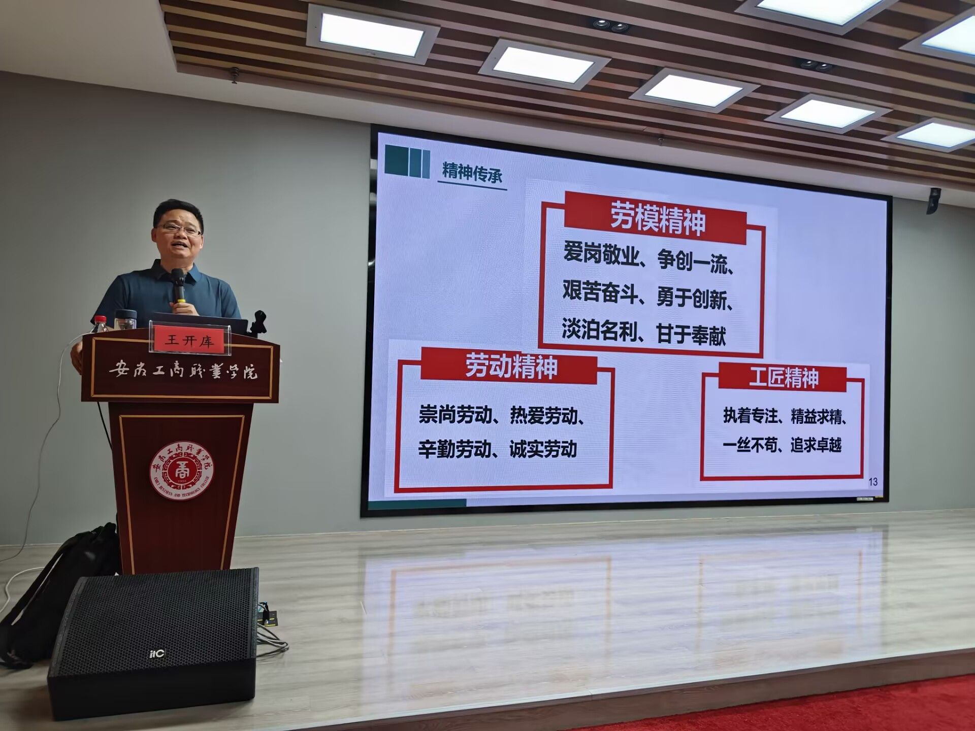 2025年6月17日,安徽工商职业学院“英模·大师进思政课堂”主题报告会在红色报告厅举行。报告会邀请全国劳动模范、中国好人王开库正高级工程师作《传承“四特”传统 践行三个精神》的主题报告。校工会主席朱炜、马克思主义学院党总支书记、院长葛成飞及100多名师生共同出席活动。报告会由马克思主义学院副院长蒋强军主持。