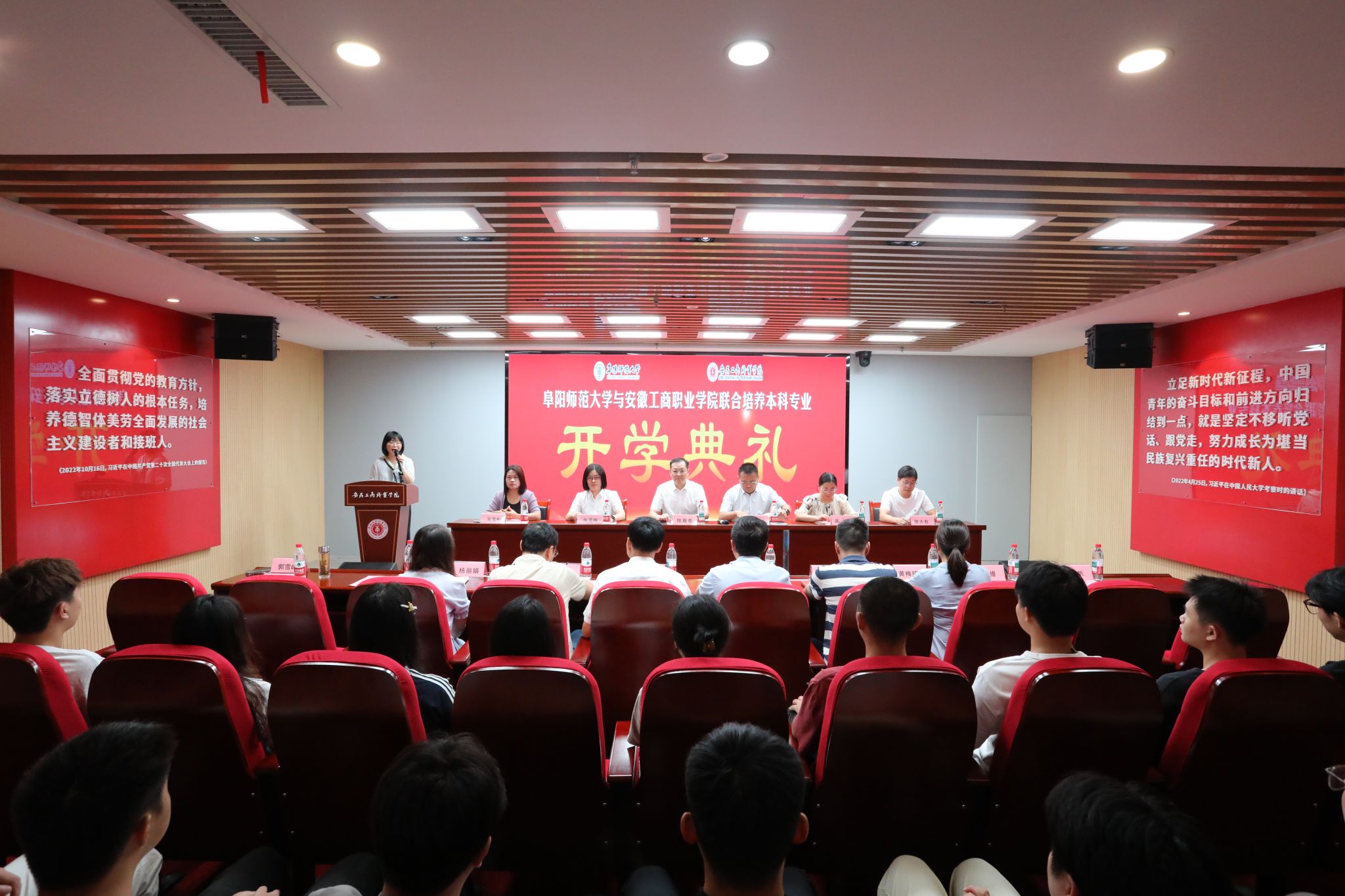 9月9日上午,阜阳师范大学与安徽工商职业学院专升本联合培养2025级新生开学典礼在我校双凤校区红色报告厅隆重举行。阜阳师范大学招生就业处处长王军一行应邀出席典礼,校党委委员、副校长陈章奇出席典礼,相关二级学院、职能部门负责人、本科班辅导员、部分任课教师和全体80名新生同学共同参加了典礼,典礼由教务处副处长郭雪峰主持。
