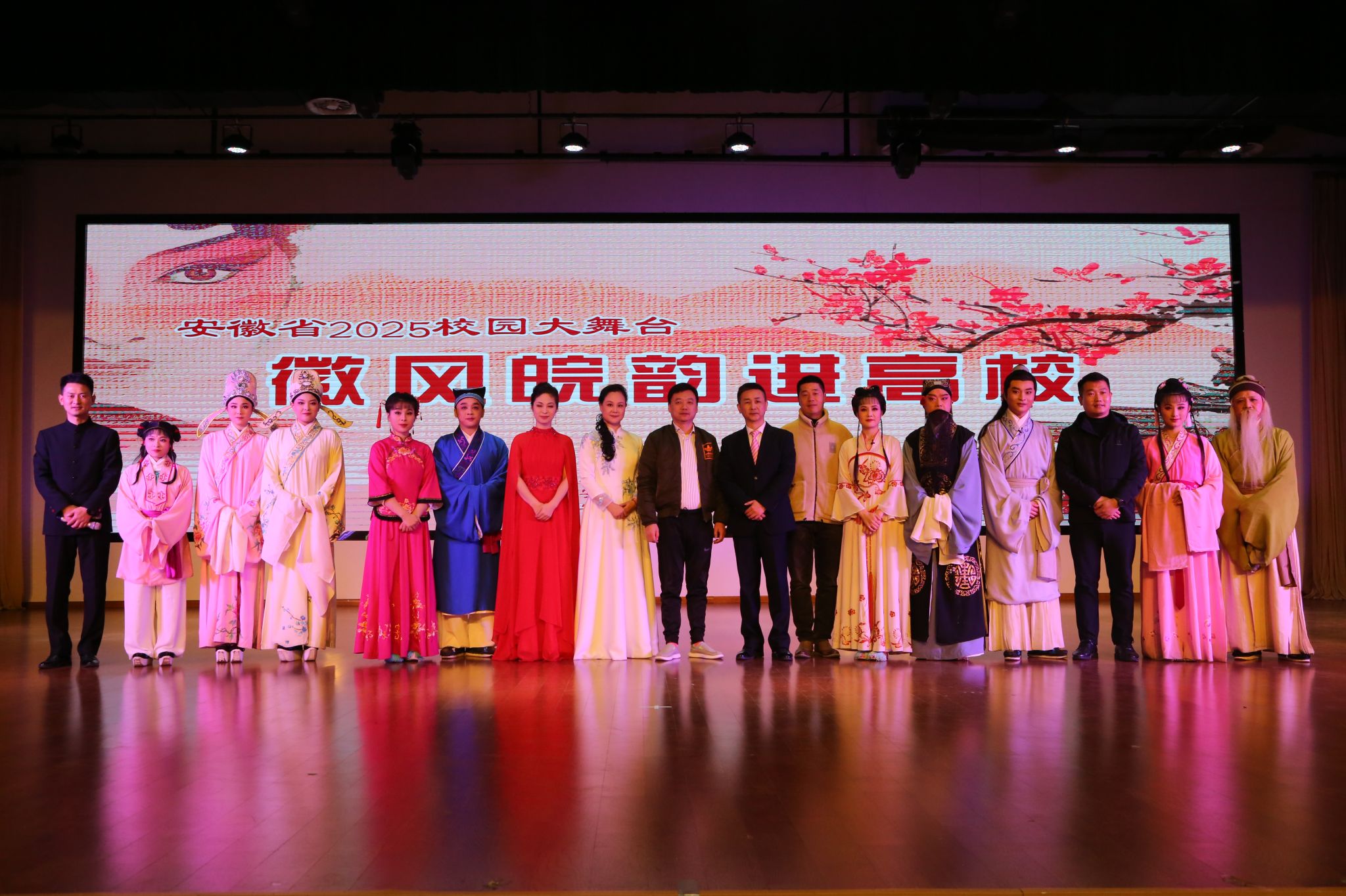 徽风皖韵润心田,黄梅雅韵绽校园,11月24日晚,由中共安徽省委宣传部、安徽省教育厅、安徽省文化和旅游厅共同主办的2025年“校园大舞台——徽风皖韵进高校”活动在我校大学生活动中心隆重上演。近六百名师生齐聚一堂,共同欣赏了一场高水准、高品位的黄梅戏艺术盛宴,感受了徽风皖韵的独特魅力。