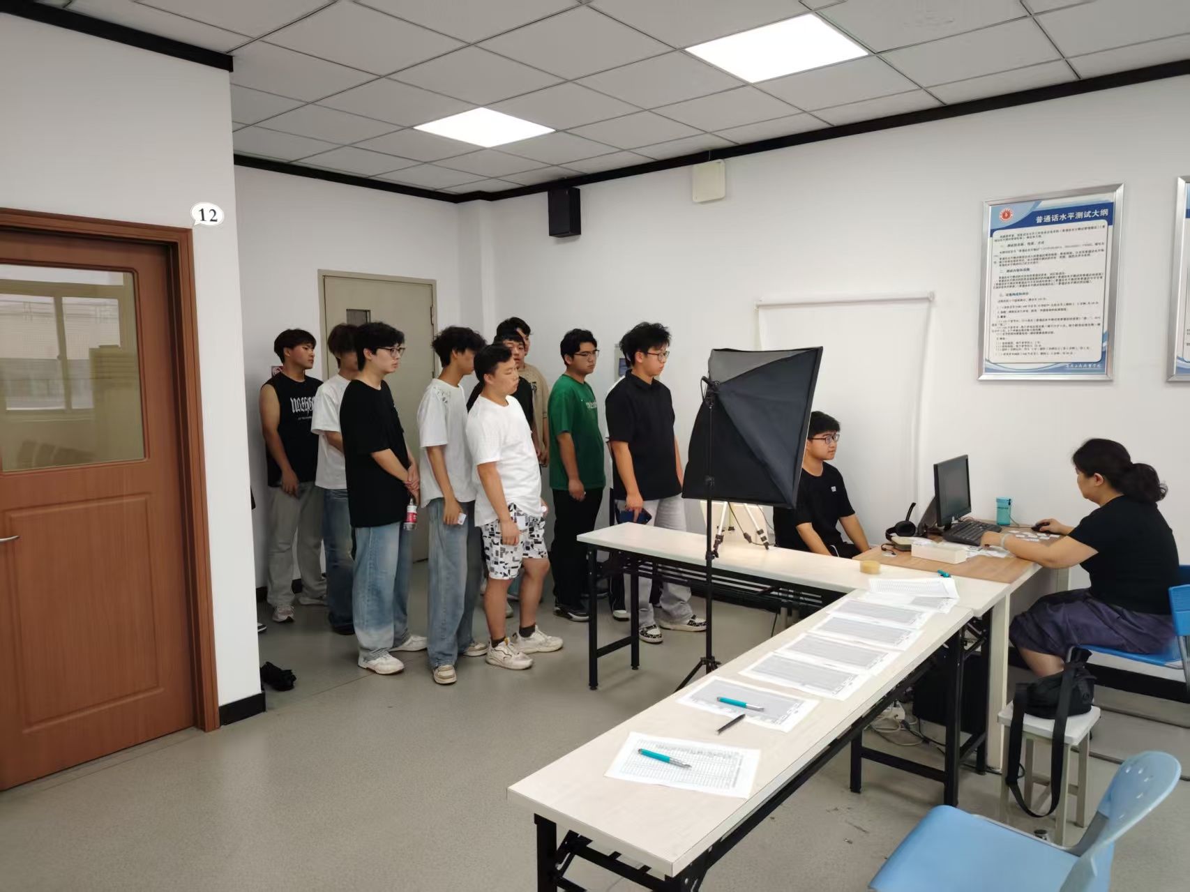 测试期间,现场实行分区管理,设有候考、备测、测试等功能区域,流程清晰,组织有序。考务人员各司其职,从身份核验、信息采集到系统操作指导,环节衔接顺畅。考生遵守纪律,认真应试,展现出扎实的普通话基础与良好的语言运用能力。