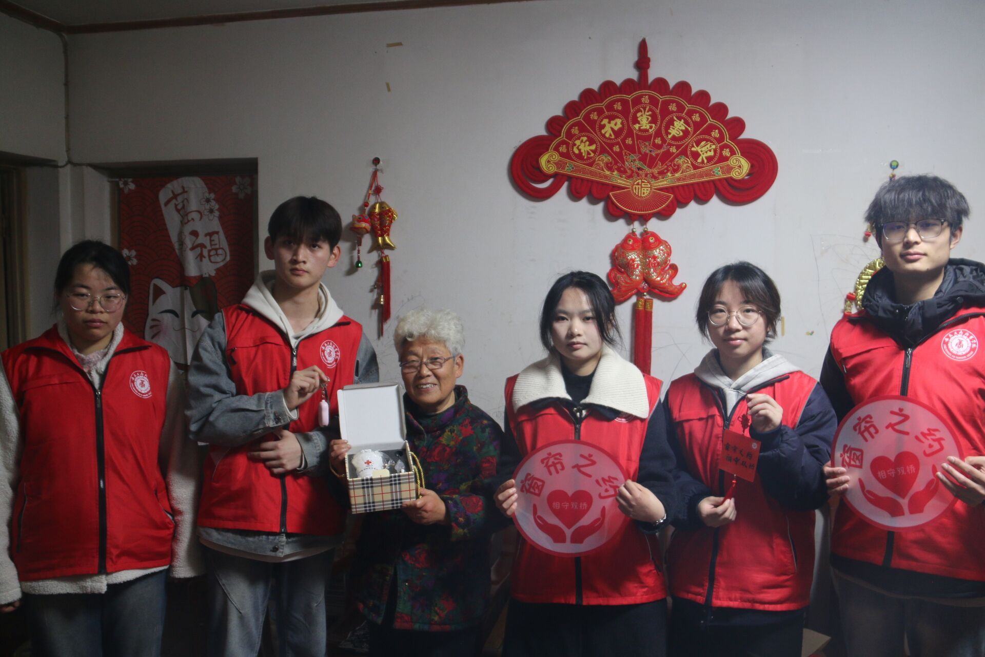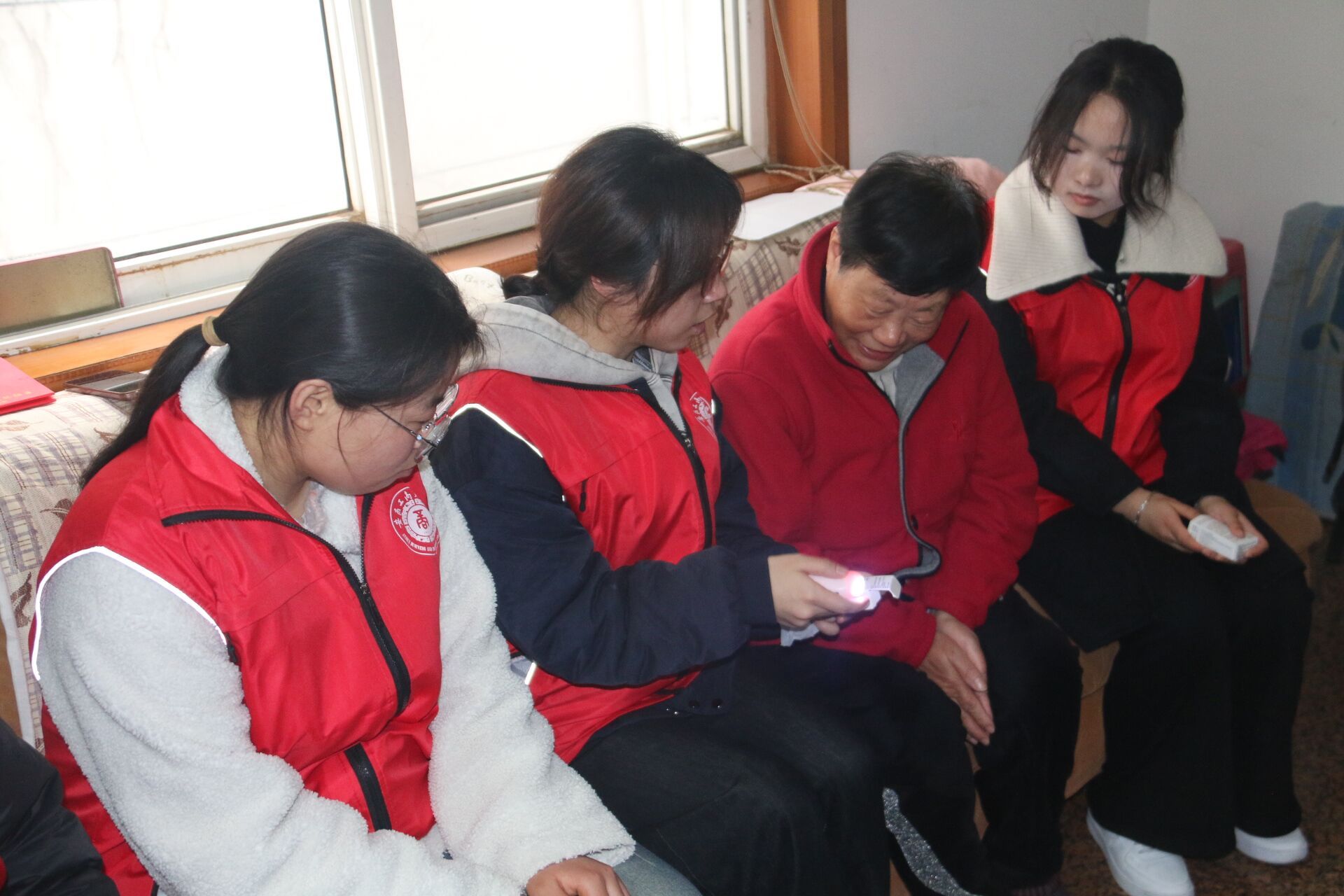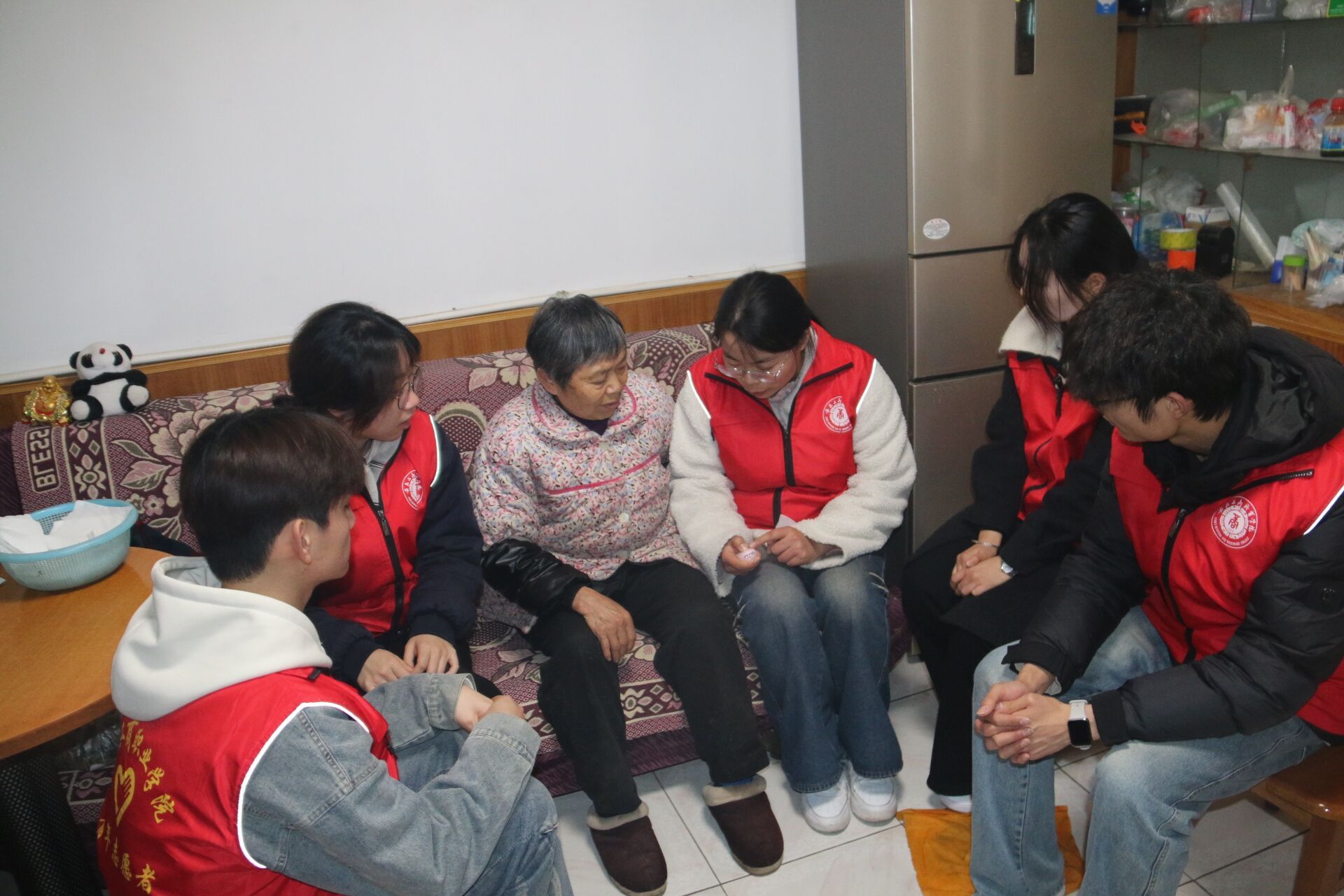 启动仪式结束后,志愿者们在社区工作人员的带领下,深入双桥社区自管小区绿都新村三户纳入“窗帘之约”服务体系的独居老人家中进行走访。每到一户,都是一次心与心的交流。志愿者们首先代表学校向老人们送上了精心准备的生活小礼品。随后,大家立刻忙碌起来:有的拿起抹布、扫帚,帮老人擦拭门窗、打扫室内卫生,让老人的居住环境焕然一新;有的围坐在老人身边,像孙辈一样陪着老人唠家常,详细询问他们的身体状况和饮食起居,耐心倾听他们的心声,用实际行动缓解老人因独居带来的孤寂感;有的将带有“窗帘之约”标识的窗花,小心翼翼地贴在老人家中的窗户上。这扇窗,不仅是房屋的通风口,更是连接社区与老人的“安全信号灯”;有的给老人分发社区专门定制的印有网格员和业委会成员联系电话的硬质钥匙扣;有的向老人介绍社区准备的居家安全报警器,并手把手地教老人如何正确使用。“奶奶,按一下可以作为夜间手提小夜灯使用,如果您遇到突发情况就按两下,它会发出报警声,社区第一时间就能收到信息赶来。”志愿者们耐心细致地讲解,为老人的居家安全加上了一道“技防”保险,让关爱更智能、更精准。