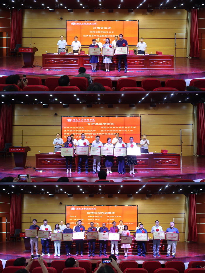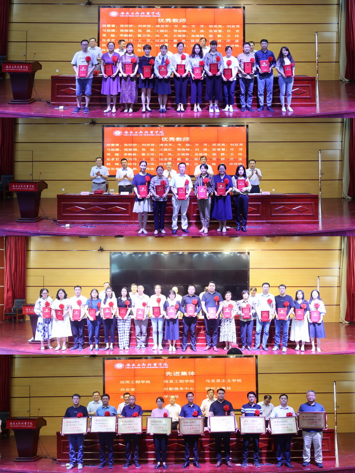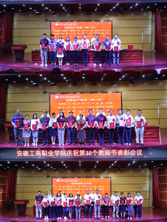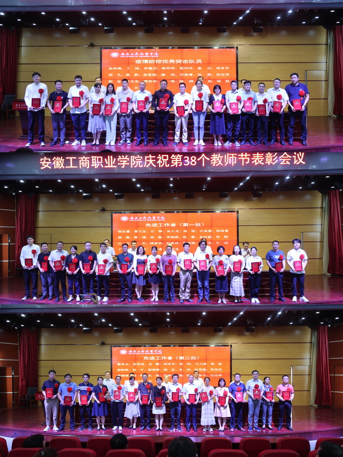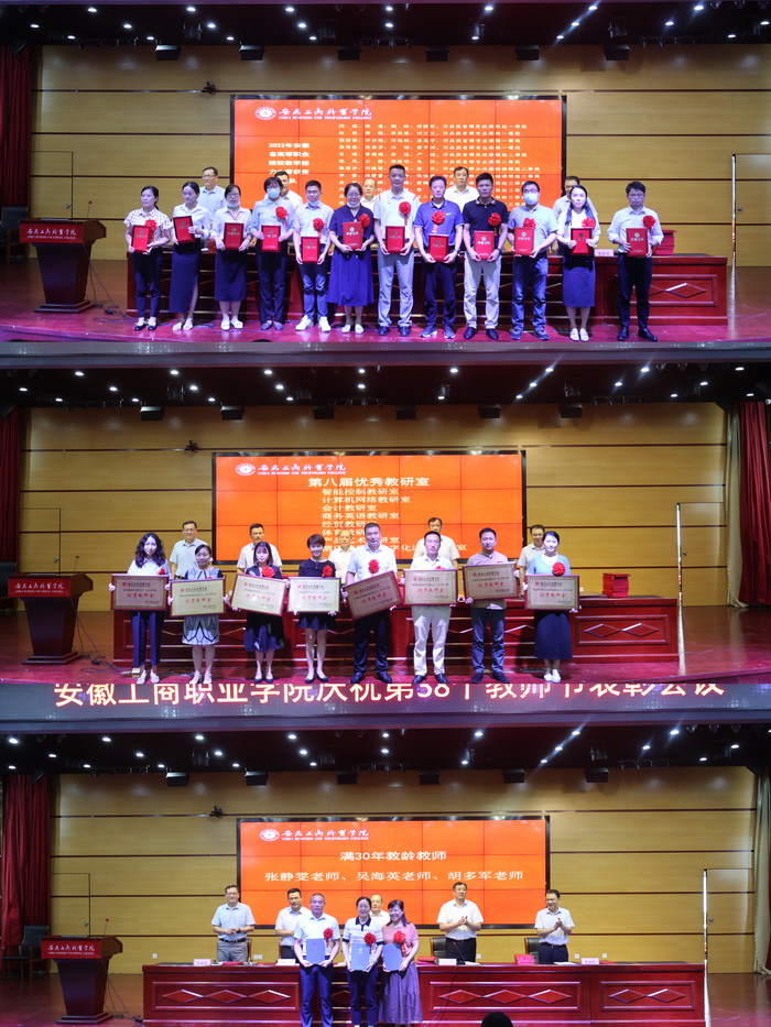 下午2时,在雄壮的国歌声中,大会正式开始。党委副书记陈行,党委委员、副院长陈章奇分别宣读了有关表彰决定。大会对12个安徽省高等职业院校教学能力大赛获奖团队、8个优秀教研室、45名优秀共产党员、19名优秀党务工作者、23名疫情防控优秀突击队员、3个红旗党组织、6个先进基层党组织、12个疫情防控先进集体、43名优秀教师、50名先进工作者、24名优秀辅导员、9个先进集体进行了表彰,为3名满30年教龄教师颁发了荣誉证书,院领导共同为受表彰对象颁奖。