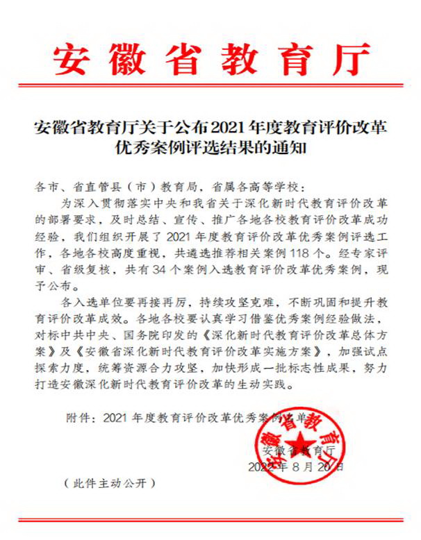 日前,安徽省教育厅公布了2021年度全省教育评价改革优秀案例名单,我校《靶向施策 深化内部质量保证体系建设》案例成功入选。此次评选活动由安徽省教育厅组织,共遴选推荐全省各地各校相关案例118个。经专家评审、省级复核,共有34个案例入选教育评价改革优秀案例。