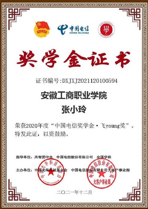 近日,由共青团中央、中国电信集团有限公司、全国学联联合开展的2020年度“中国电信奖学金”遴选结果正式揭晓,我校管理学院2019级连锁经营管理2班张小玲同学获得2020年度“中国电信奖学金·飞Young奖”。