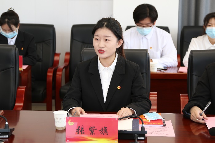 学生团干代表、应用工程学院团总支学生副书记张紫旗结合4月25日习近平总书记考察中国人民大学重要讲话精神及自己暑期三下乡所见所思所想进行了分享,表示将牢记习近平总书记的殷殷嘱托和亲切教诲,在加强和改进基层团组织思想引领力、引导团员青年坚定理想信念、筑牢校园疫情防控防线等方面发挥共青团主力军与突击队作用,坚定不移听党话、跟党走,用实际行动践行“请党放心,强国有我”的铮铮誓言。