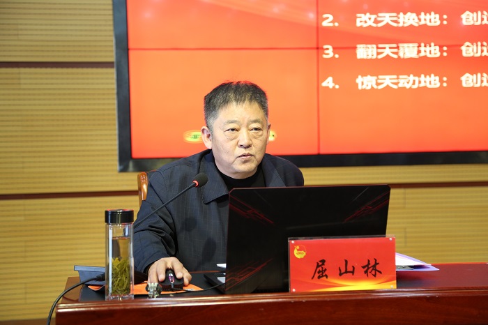 开班仪式结束后,屈山林为广大学员做了题为《奋斗百年路 启航新征程》的专题讲座。讲座中,他结合百年党史,从丰功伟绩、恢宏史诗,精神血脉、代代相传,以史为鉴、开创未来三个篇章解读了习近平总书记“七一”重要讲话的精神要义和深刻内涵,带领同学们了解中国共产党团结带领人民通过浴血奋战完成新民主主义革命,建立起中华人民共和国的光辉历程。他列举诸多中国共产党人不怕牺牲、英勇斗争的革命故事,生动讲述伟大建党精神,勉励同学们铭记历史,不忘初心,坚定理想信念;努力学习,勇挑重担,为实现第二个百年奋斗目标新的赶考之路奉献力量,践行“请党放心,请祖国放心,强国有我”的铮铮诺言。