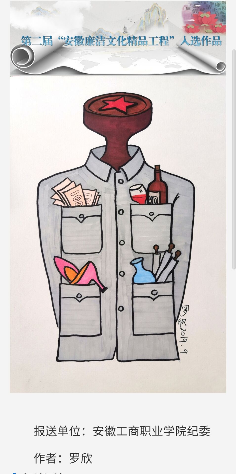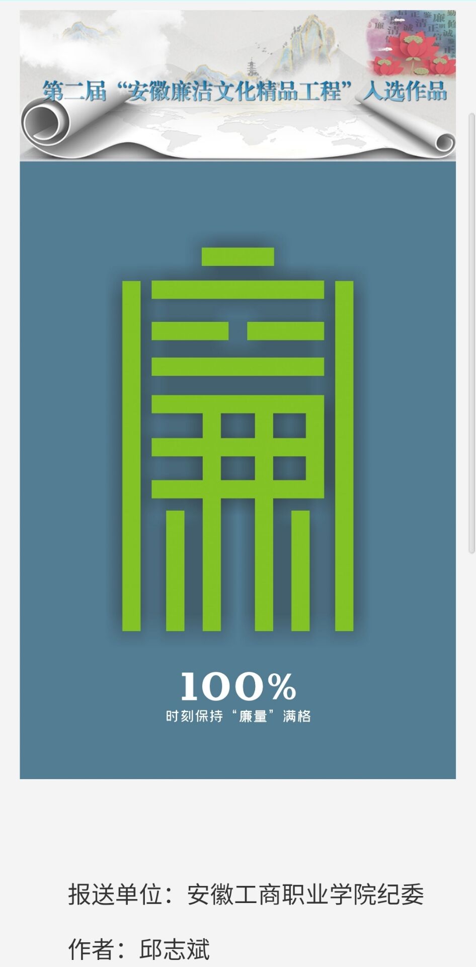 近日,省纪委监委网站展播了第二届“安徽廉洁文化精品工程”入选作品。在面向全省征集的广电、“三微”、平面、曲艺、书籍等五大类廉洁文化作品中,共1561件作品进入复评,经过复评、专家终评、会议研究、领导审定,最终确定490件作品作为第二届“安徽廉洁文化精品工程”入选作品,其中由我校艺术设计学院邱志斌老师创作的平面公益广告《廉量》、艺术设计学院学生罗欣创作的漫画《口袋的“妙用”》两件作品成功入选,学校纪委荣获优秀组织奖。