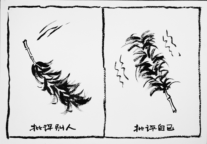 此幅漫画作品通过鸡毛掸子的不同造型表现了在开展批评与自我批评时的不良现象,主旨鲜明,寓意深刻。
