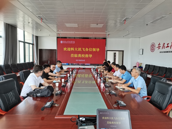 8月26日上午,我校与科大讯飞股份有限公司校企合作对接会在双凤校区综合楼三号会议室举行。科大讯飞股份有限公司高教人才培养部副总裁胡江院、咨询总监王生波、人才培养产品线华北区域总监陈永菲、总裁助理许业林、安徽工商职业学院校长李雪、副校长汪贤武出席会议,会议由李雪主持。