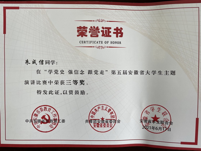 日前,由中共安徽省委教育工委、共青团安徽省委、安徽省学生联合会主办的第五届安徽省大学生主题演讲比赛在合肥学院成功举办。我校朱成信同学在比赛中表现突出,荣获省赛三等奖。