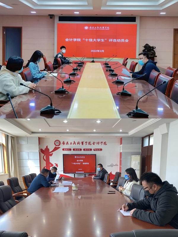 “十佳大学生”评选活动,是会计学院为深入学习贯彻习近平新时代中国特色社会主义思想,广泛开展先进典型教育,着力加强思想政治引领,激励引导广大青年学生不忘初心、奋发成才,营造积极向上、榜样示范良好院风的具体举措。根据《关于开展安徽工商职业学院2021年度“十佳大学生”评选的通知》和《安徽工商职业学院学生手册》相关条例及要求,会计学院于2022年4月开展并顺利完成了院级评选工作。并与评审结束后,由院团总支书记陈嵊与部分同学进行了座谈,勉励“十佳大学生”们在防疫抗疫、校园学习生活、青年志愿者服务等各个方面展现“十佳”风采。