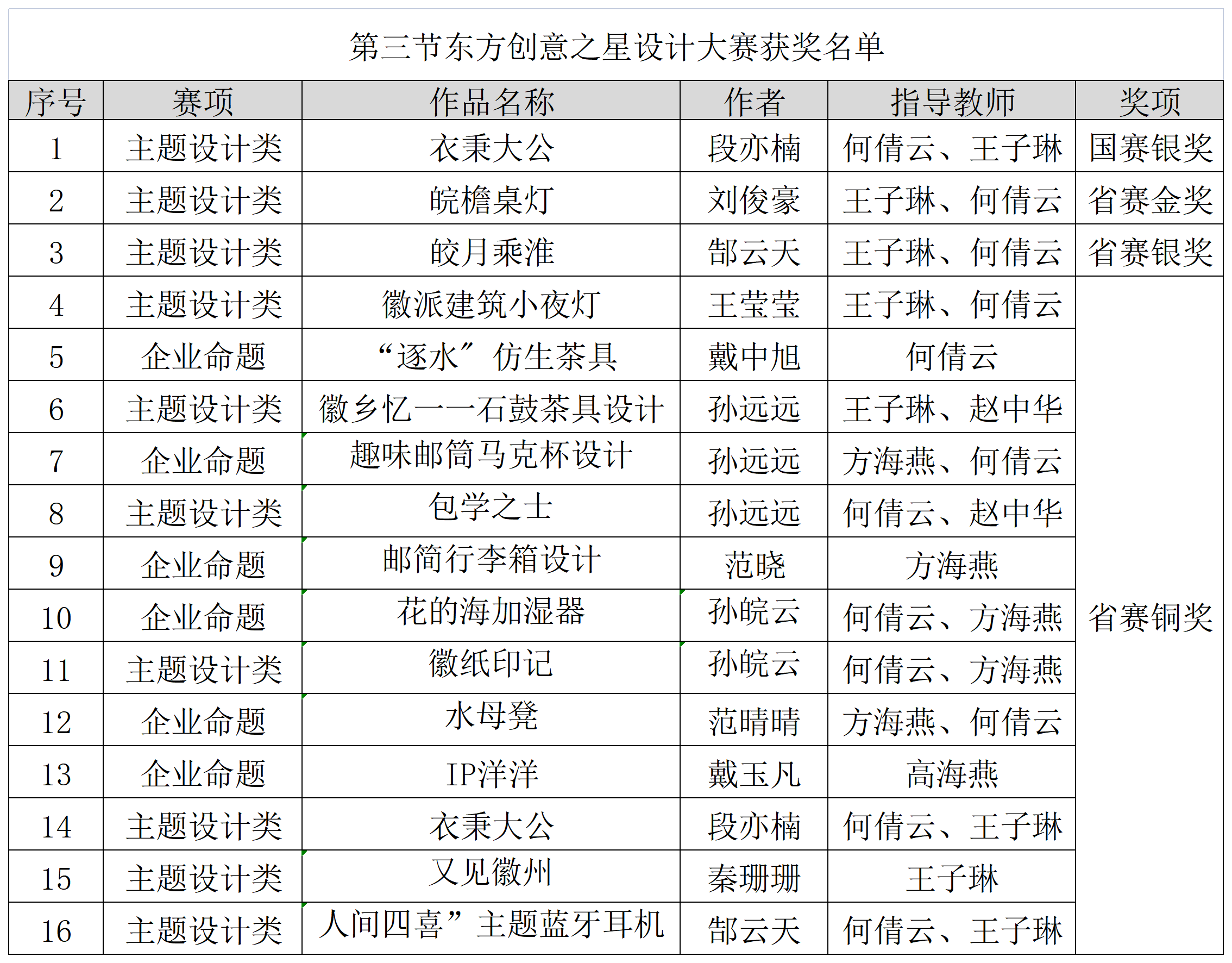 近日,由工业和信息化部国际经济技术合作中心为指导单位,东方创意之星设计大赛组委会主办的第三届东方创意之星设计大赛获奖结果公布。大赛以“设计驱动·产教融合”为主题,覆盖自由命题类、企业命题类、主题设计类三大类别。参加本届大赛的高校共计1030所,参赛作品共计19938件。艺术设计学院师生在本届大赛中共获等级奖项16项,其中省赛金奖1项、银奖1项、铜奖13项;20级产品艺术设计1班段亦楠同学作品《衣秉大公》获得全国赛银奖。除此以外,安徽工商职业学院被大赛组委会评为省赛及全国赛“优秀组织单位”。
