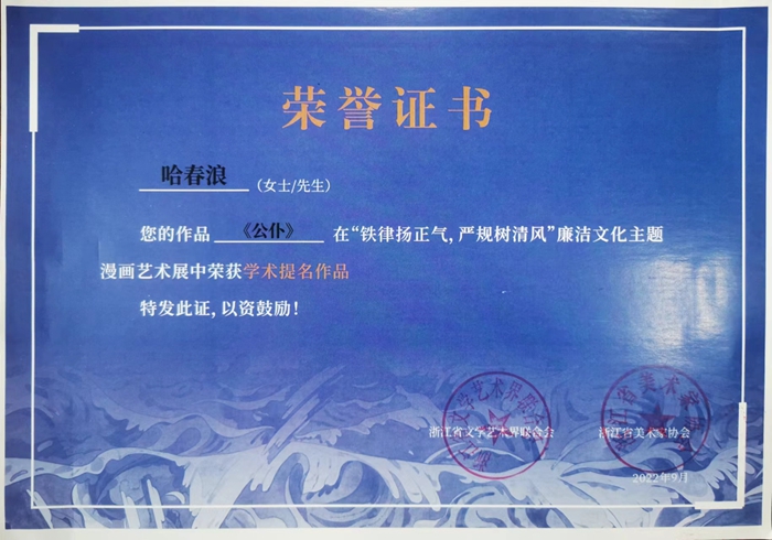 丰富艺术形式,讲好廉洁故事,打造新时代清廉建设高地,是艺术设计学院开展党风廉政建设的特色做法之一。近日,学院党总支副书记、副院长哈春浪漫画作品《公仆》荣获“铁律扬正气、严规树清风”廉洁文化主题漫画艺术展“学术提名奖”。