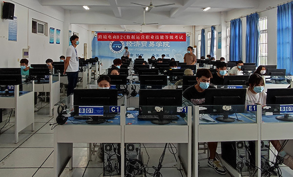 “1+X”跨境电商B2C数据运营职业技能等级证书考试由阿里巴巴(中国)网络技术有限公司负责实施,主要面向跨境电子商务 B2C 应用和服务企业的跨境电商运营、数据分析和数字营销等岗位。作为该证书安徽省试点院校和考核站点,经济贸易学院认真安排学生考前准备和训练,组织技术人员进行了软硬件设备调试、考务人员培训、疫情防控演练等筹备工作。考试严格按照“1+X”证书制度考核管理规定进行,考试过程纪律严明,服务保障有力,疫情防控到位,考试严谨有序。