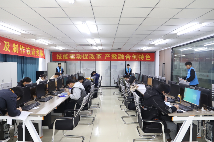 为达到“以赛促学、以赛促教、以赛促改”的目的。赛前,学院认真准备,精心谋划,安排指导教师对学生进行集中培训、指导。技术保障组提前检查比赛场地,对比赛设备进行了检修,确保比赛顺利进行。按照赛项安排,七个赛项分别在各自场地有序展开。赛场上,选手们沉着应赛、细致严谨,展现出了良好的技能素养和心理素质;裁判员敬业负责,裁决公正、公平、专业;纪检监察组认真履职,对比赛各环节严格监督。赛场外,竞赛事务组、竞赛服务组立足岗位,热心服务;宣传报道组工作到位,报道及时,营造了浓郁的技能节氛围。