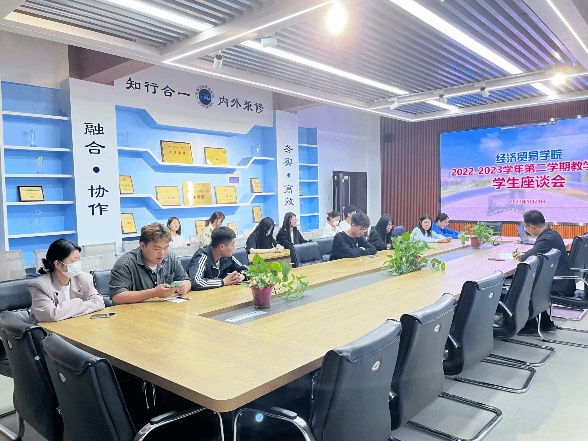 为深入了解教师课堂教学管理情况,切实提高教育教学质量,5月24日下午,经济贸易学院组织召开2022-2023学年第二学期教学工作学生座谈会。学院2021级、2022级各班级学生代表参会,教务科长张键主持会议。