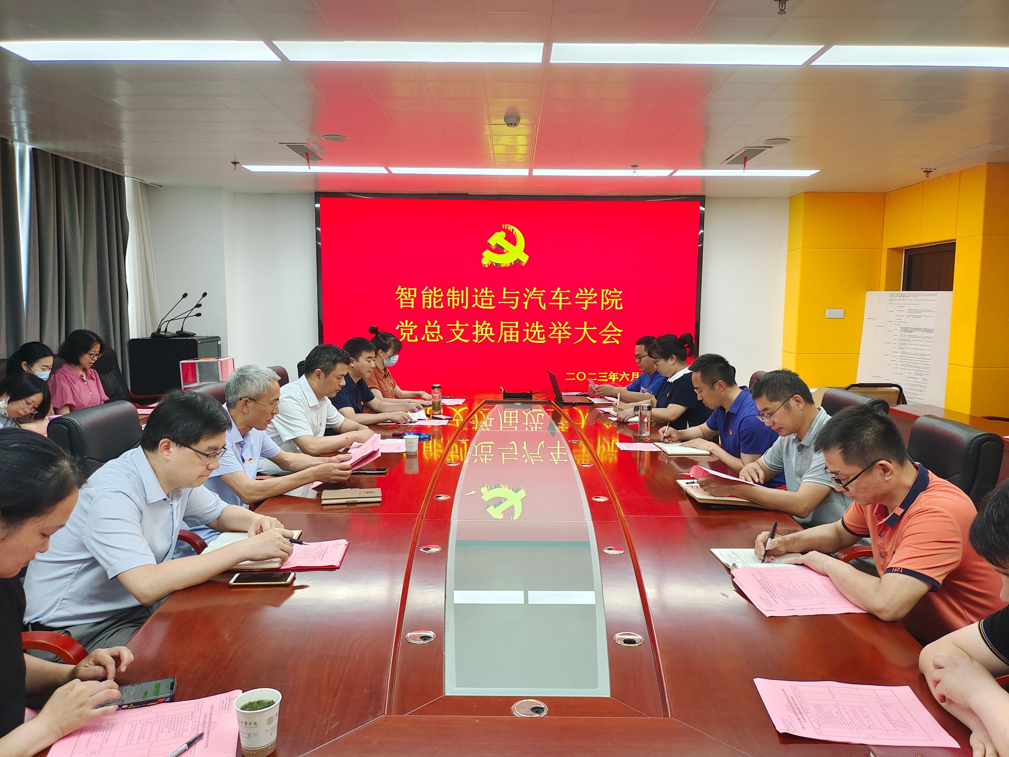 根据《中国共产党章程》《中国共产党基层组织选举工作条例》及学校《关于二级学院党总支换届选举工作的通知》的有关程序及校党委的批示要求,智能制造与汽车学院党总支于6月30日中午在第六会议室召开换届选举大会,选举产生了新一届智能制造与汽车学院党总支委员会。校党委副书记陈行,组织人事处吴静老师到会指导,会议由学院党总支书记丁浩主持,全体党员参加会议。