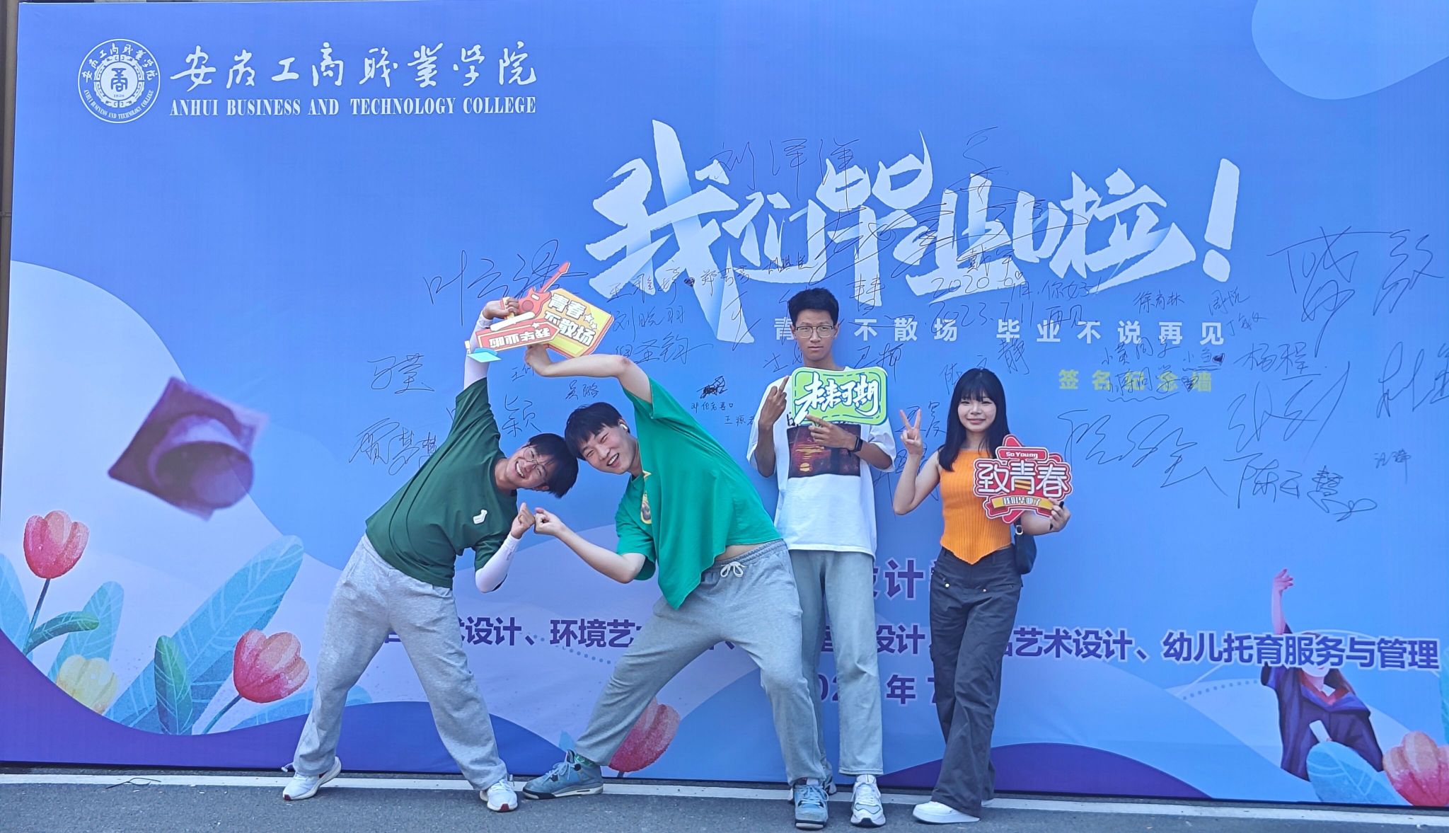 为使同学们三年的校园生活划上圆满的句号,在学校留下青春最美的记忆,学院制作了签名墙,并贴心的准备好拍摄道具、签字笔等物品,供同学们拍照留念。学院领导、老师还与同学们亲切合影。