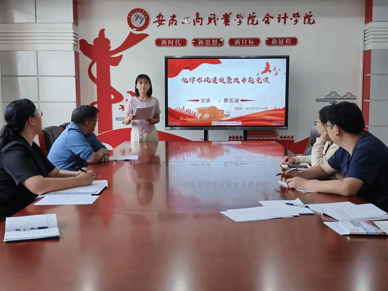 为深入学习贯彻党的二十大精神,营造向上、向善、向廉的学院文化氛围,增强学院领导班子成员廉洁自律意识,树立新风正气。9月26日下午,会计学院党总支在明德楼二楼党建会议室召开党总支委员会议,开展廉政党课和警示教育专题学习,全体党总支委员参加了学习。