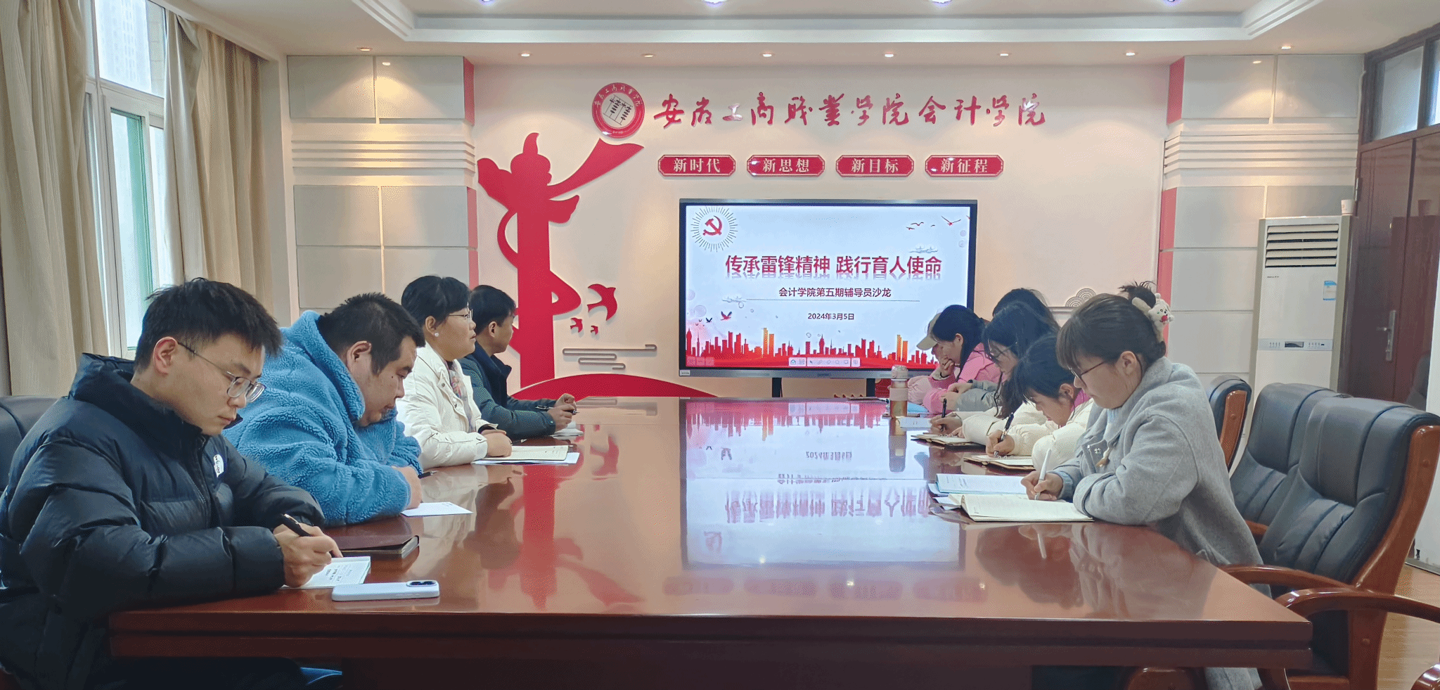 为深入贯彻落实习近平总书记“深刻把握雷锋精神的时代内涵,让雷锋精神在新时代绽放更加璀璨的光芒”的重要指示精神,3月5日会计学院在明德楼二楼党建会议室开展“传承雷锋精神 践行育人使命”第五期辅导员沙龙。学院党总支书记赵艳、副书记李峰及全体专职辅导员参与活动。