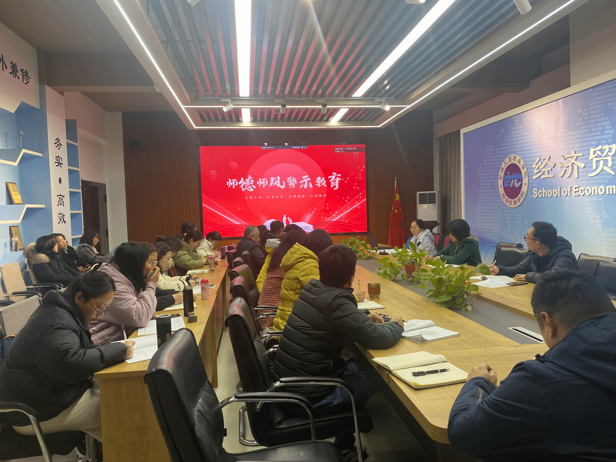 3月6日下午,经济贸易学院党总支在5楼教师能力提升中心召开理论学习中心组学习(扩大)会议暨师德师风建设专题会议,会议由党总支副书记、院长张颖主持,全体教职工参加会议。