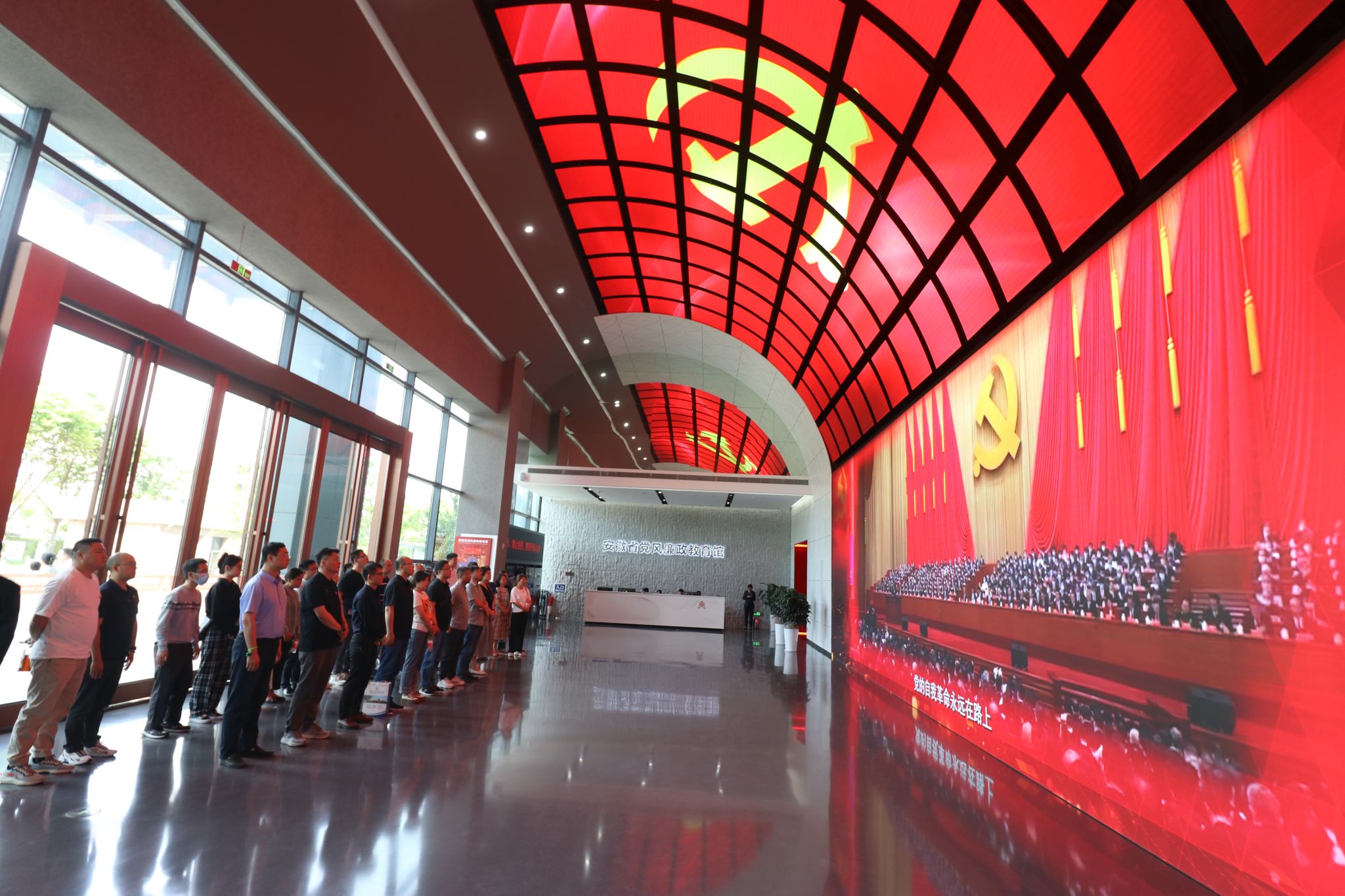 在讲解员的带领下,大家首先集中观看了《永远在路上》专题片,之后参观了“纪律立党•从严治党”“廉润江淮•清风扬帆”“以案为鉴•警钟长鸣”“不忘初心•永葆清廉”四个展厅。通过观看展板、视频播放、互动查询、场景还原、沉浸式体验等方式,全方位回顾中国共产党筚路蓝缕的百年纪律建设史,全领域展现安徽省委全面从严治党、党风廉政建设和反腐败斗争的成果。最后,在宣誓厅,面对鲜艳的中国共产党党旗,大家一起举起右手、紧握拳头,重温入党誓词。