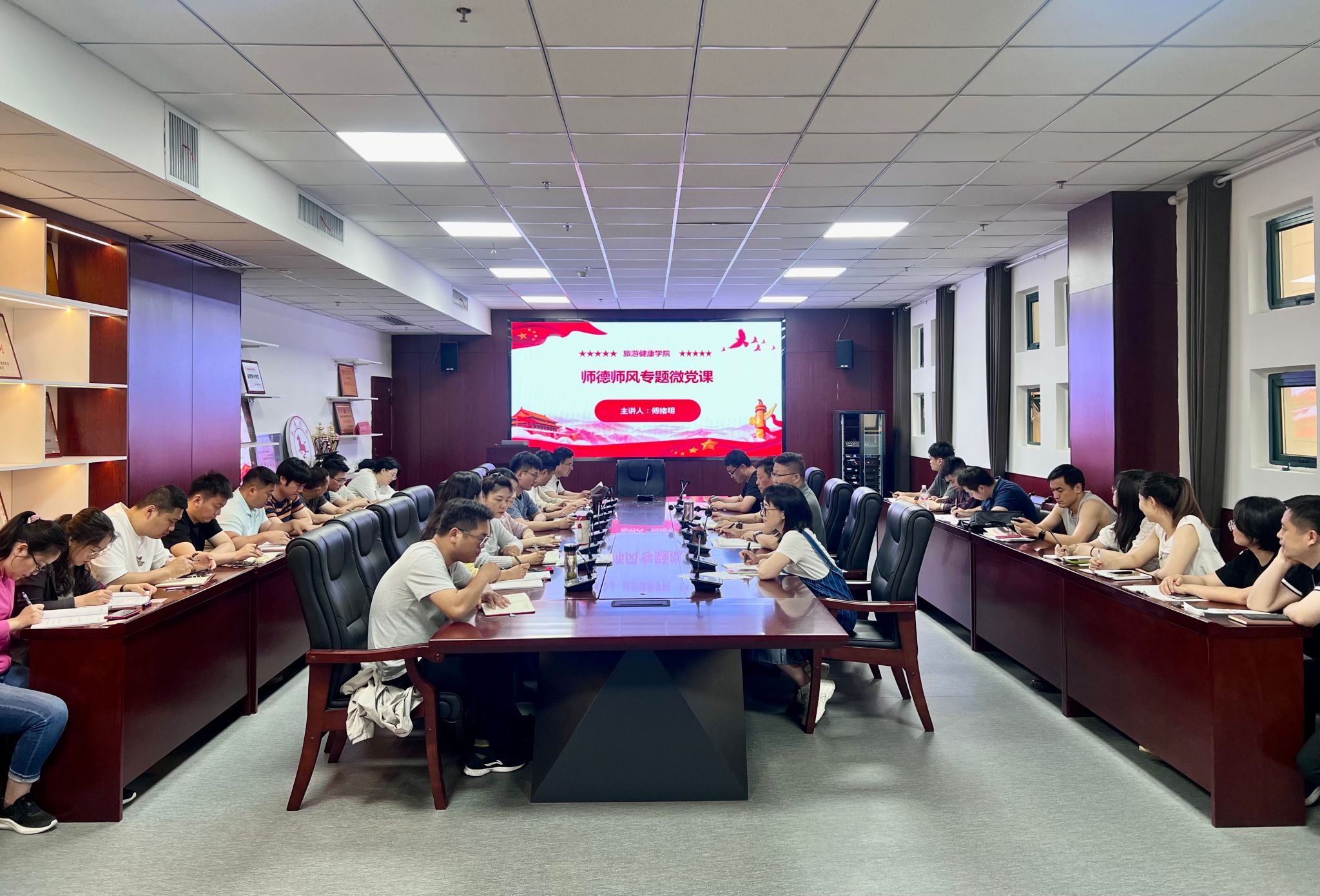 旅游健康学院院长傅绪明以师德师风建设为主题给全院教职工上了一堂生动的微党课,傅绪明通报了违反教师职业行为的十项典型案例,他强调全体教职工要深入学习贯彻习近平总书记关于师德师风建设的重要讲话精神,把师德师风看作是教师评价的第一标准,时刻保持自觉自律,严守底线和红线,争做有理想信念、有道德情操、有扎实学识、有仁爱之心的新时代“四有”好老师。