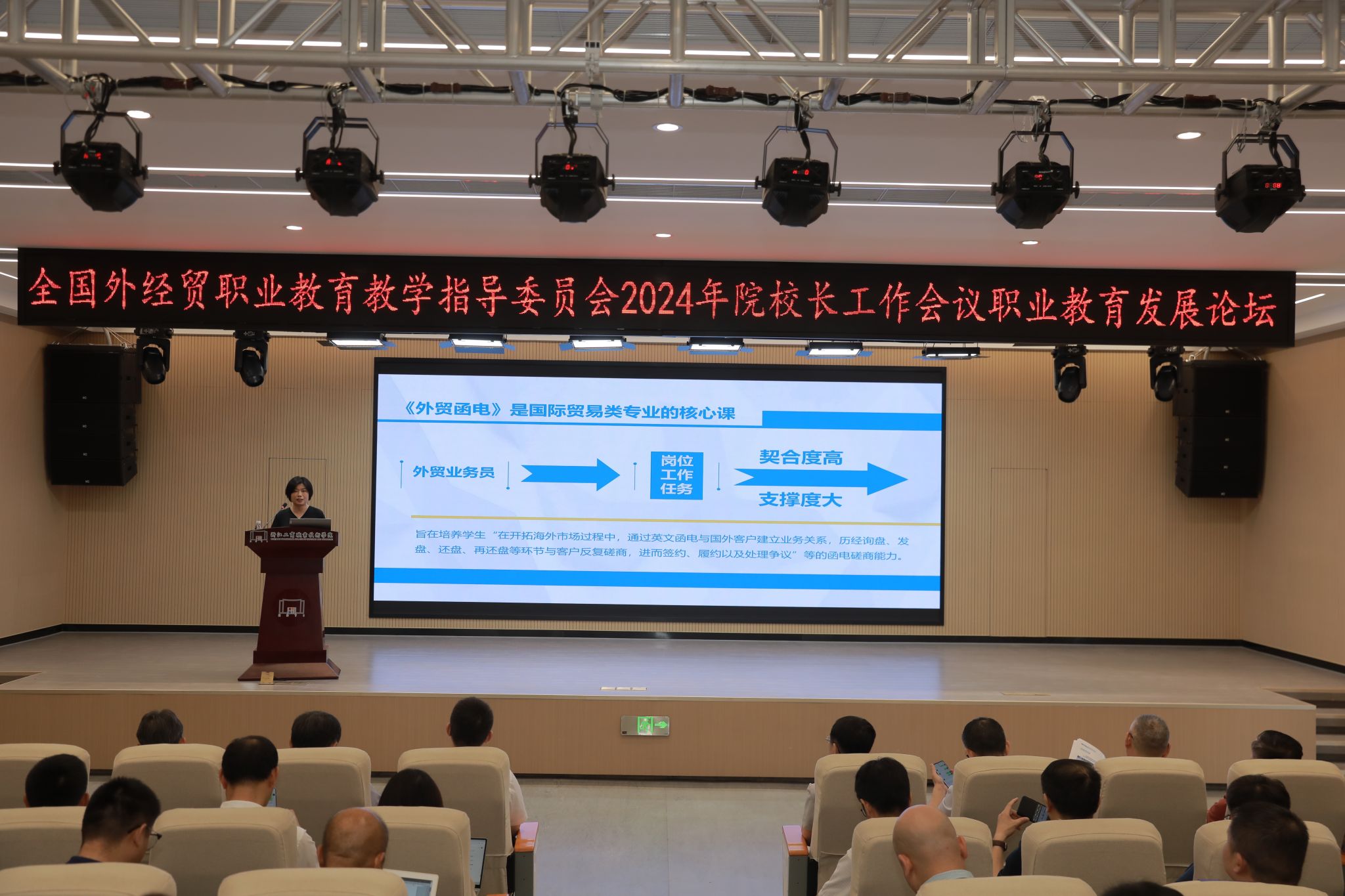 在7月4日进行的全国外经贸职业教育教学指导委员会2024年院校长工作会议职业教育发展论坛上,我校经济贸易学院院长张颖教授应邀作了首批“十四五”职业教育国家规划教材-《<外贸英文函电>教材建设实践与体会》的主旨发言。她从教材建设历程与简介、教材编写原则与理念、教材设计内容与特色、教材实践应用与效果、教材建设体会与思考等五个方面进行了教材建设经验分享,进一步探析了深化教材建设,推进职业教育教材改革方面的探索方向和实施路径,受到与会人员的一致好评。(撰稿:吴浩波 审核:张颖)