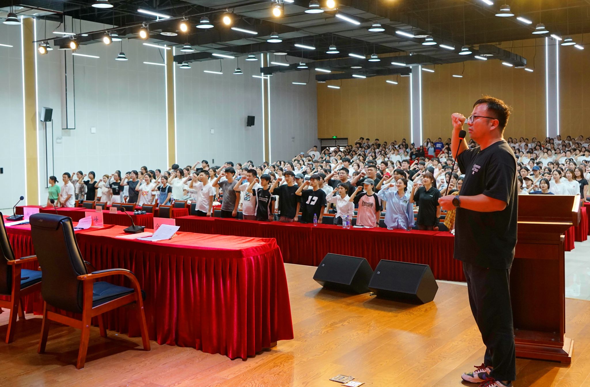 随后,全体新生在辅导员陈嵊的带领下进行了宣誓,在庄严的宣誓声中,新生承诺将以最饱满的精神面对新的校园生活,迎接新的挑战。