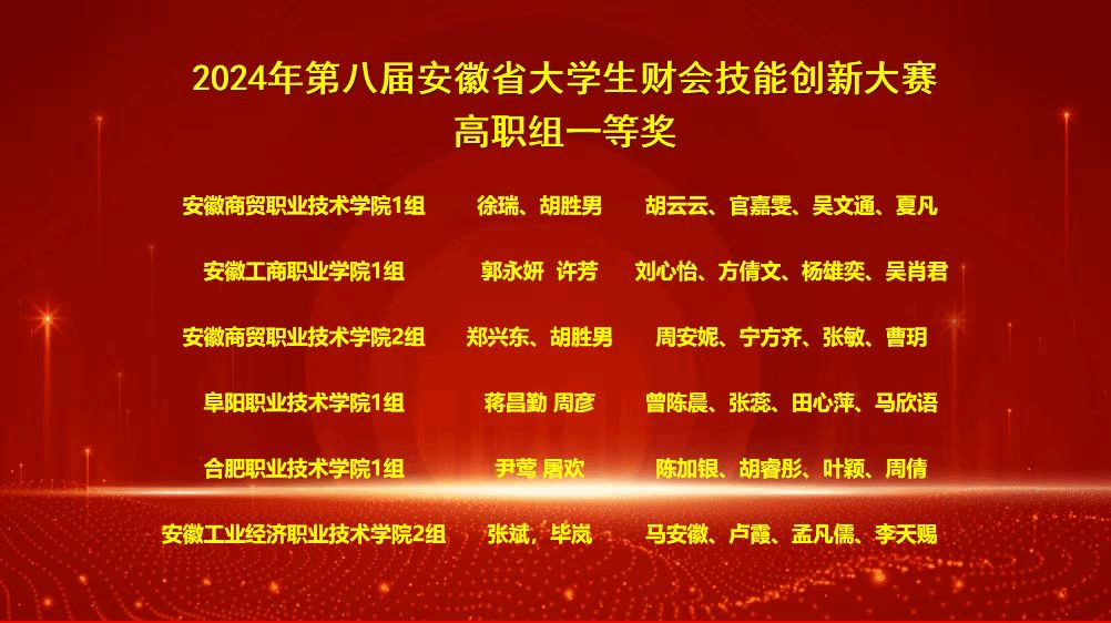 2024年11月24日,由安徽省教育厅主办、铜陵学院承办的第八届安徽省大学生财会技能创新大赛圆满结束。经过严格的选拔和激烈的角逐,我校刘心怡、方倩文、杨雄奕、吴肖君四名学生组成的1队荣获高职组一等奖,李雪围、王焱锐等8名同学组成的2队、3队分别获得了二等奖和三等奖。