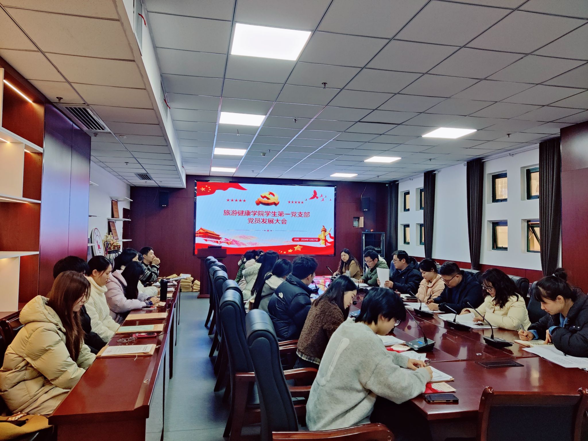 2024年12月27日中午,旅游健康学院学生第一党支部在学院三楼会议室召开全体党员大会讨论关于接收纪媛媛等8名同学为预备党员事宜。旅游健康学院党总支书记杨锐到会指导,会议由支部书记张亚运主持。