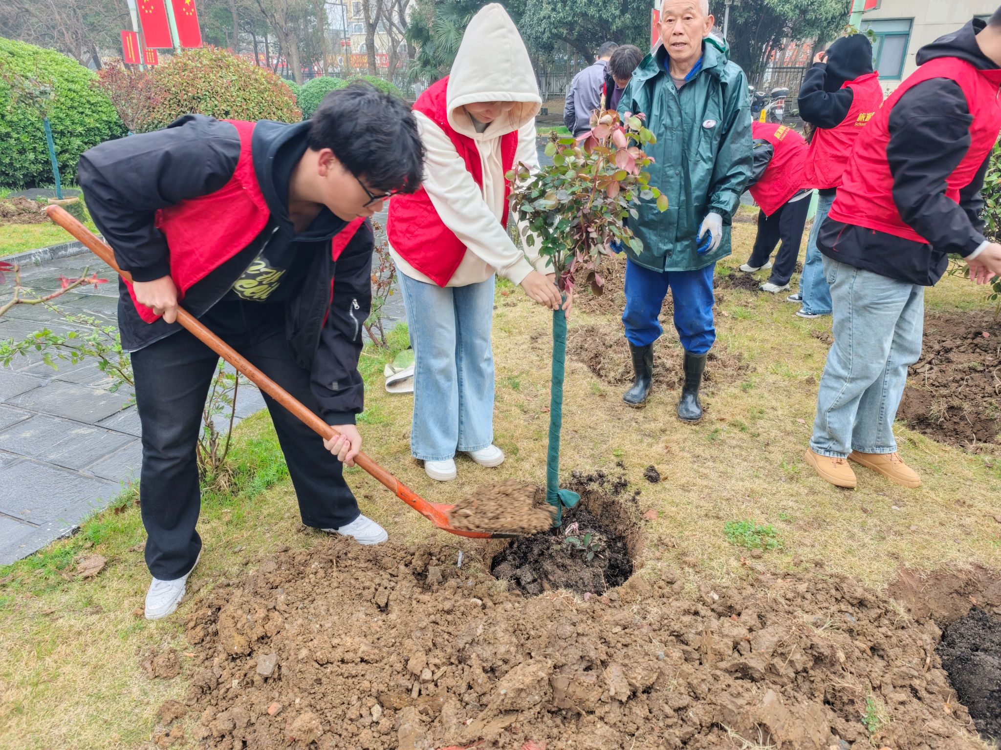学院师生党员和志愿者们共同参与植树。活动中,大家分成若干小组,分工协作,默契配合,充分发挥先锋模范作用,个个热情洋溢、干劲十足。有的挥锹铲土,为树苗刨出一个个充满希望的树坑;有的小心翼翼地扶着树苗,确保它们能够笔直地扎根大地;有的则提水浇灌,让每一棵树苗都能喝到充足的 “生命之水”。在大家的带动下,现场的每一个人都积极投入到植树劳动中,欢声笑语回荡在植树现场的每一个角落。