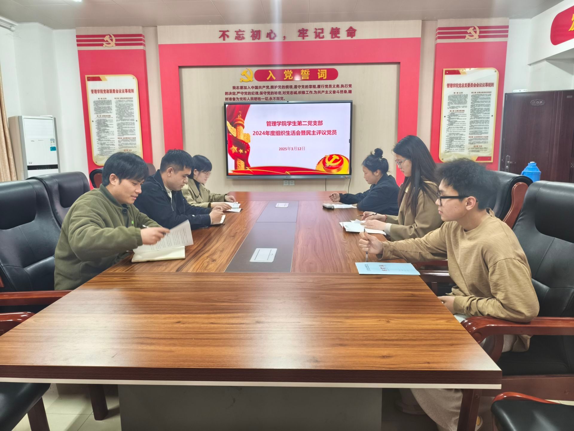 3月12日下午,管理学院学生第二党支部于管理学院108党员活动室召开2024年度组织生活会,并开展民主评议党员工作。教师党员及学生党员参加会议,党支部书记毕筱菁主持会议。