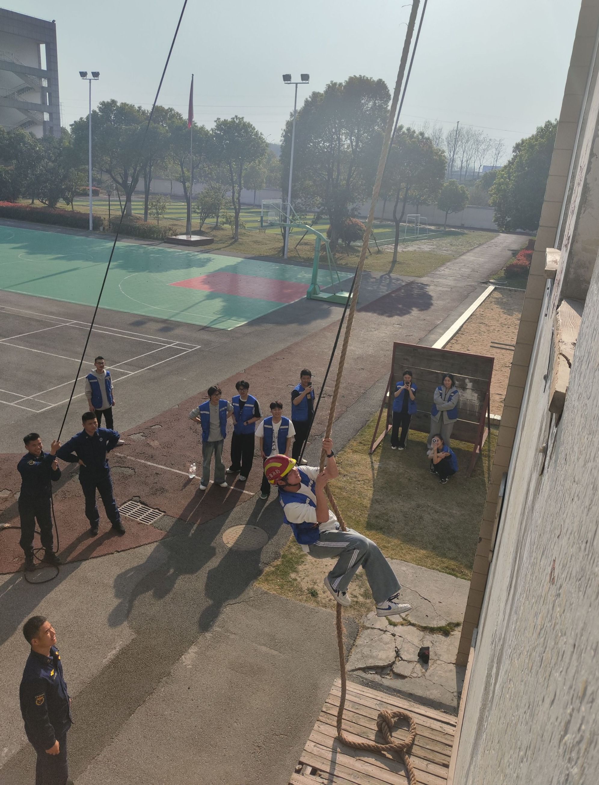 在消防员的带领下,学生们有序参观了消防车辆、灭火救援装备和训练场地。消防员结合日常救援经验,详细介绍各类器材的功能及使用方法,现场演示液压破拆工具、高压水炮等专业设备的操作技巧,并邀请学生穿戴消防服、体验绳索攀爬训练,沉浸式感受消防救援的复杂性与危险性。“穿上约15公斤的装备,我连走路都困难,难以想象消防员们要穿着它冲进火海救援,他们用血肉之躯守护万家平安,是当之无愧的英雄!”2023级国贸专业学生何星锐同学在体验后感慨道。