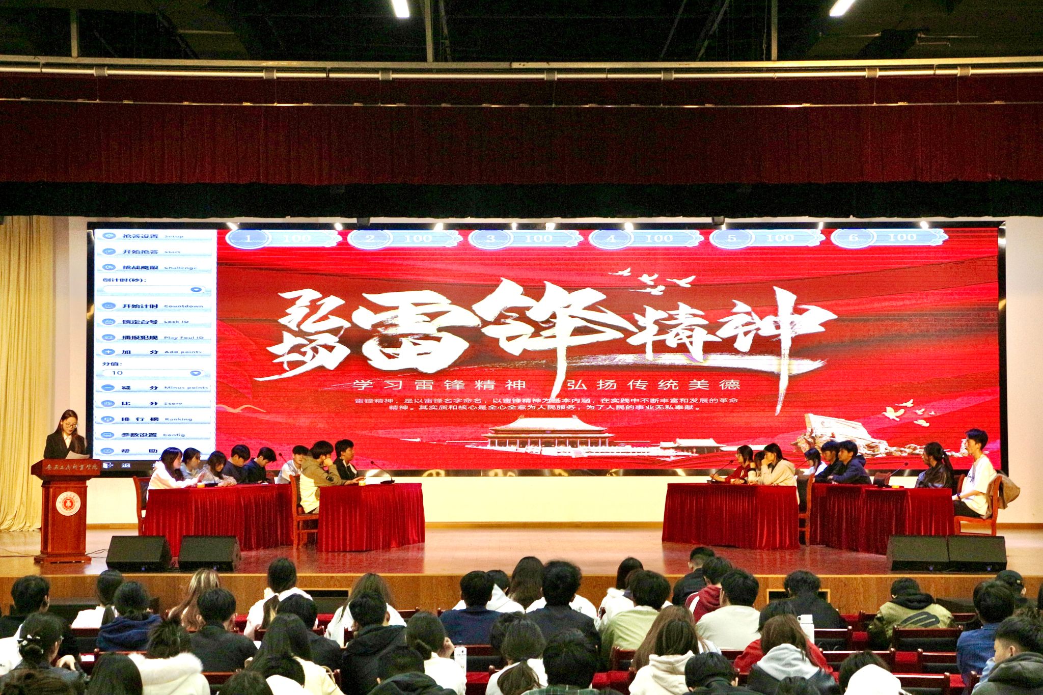 本次竞赛分为初赛和决赛两个阶段。初赛采用必答题和抢答题环节,决赛增设风险题环节。题目内容涵盖雷锋生平事迹、雷锋精神内涵、党史等。