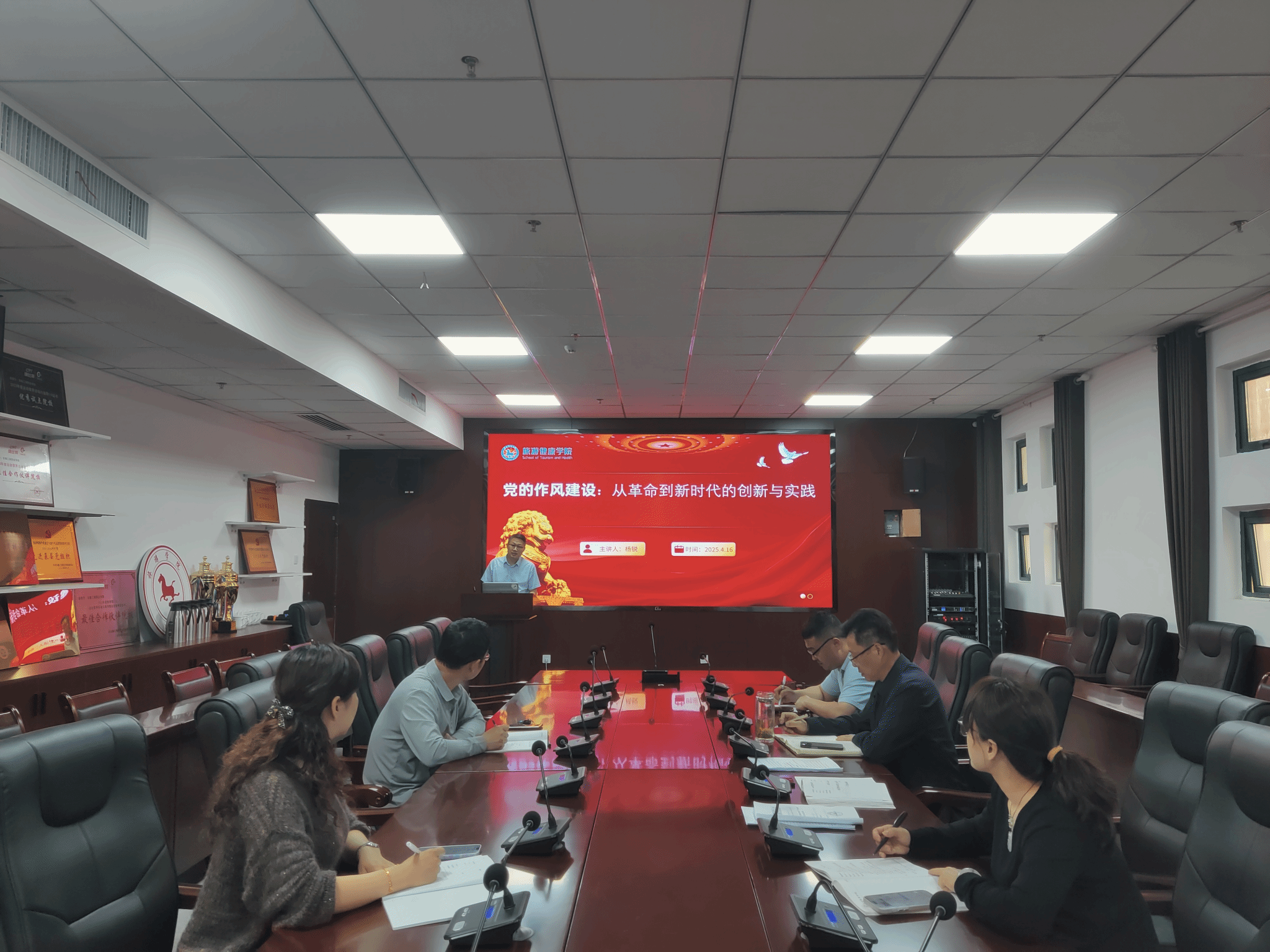 杨锐以《党的作风建设:从革命到新时代的创新与实践》为题,给全体与会人员上了一堂生动精彩的微党课。他以党的发展历程为脉络,全面回顾了从新民主主义革命时期到中国特色社会主义进入新时代,党的作风建设的演进与创新,结合《整顿党的作风》这篇文章内容指导学院现实工作。
