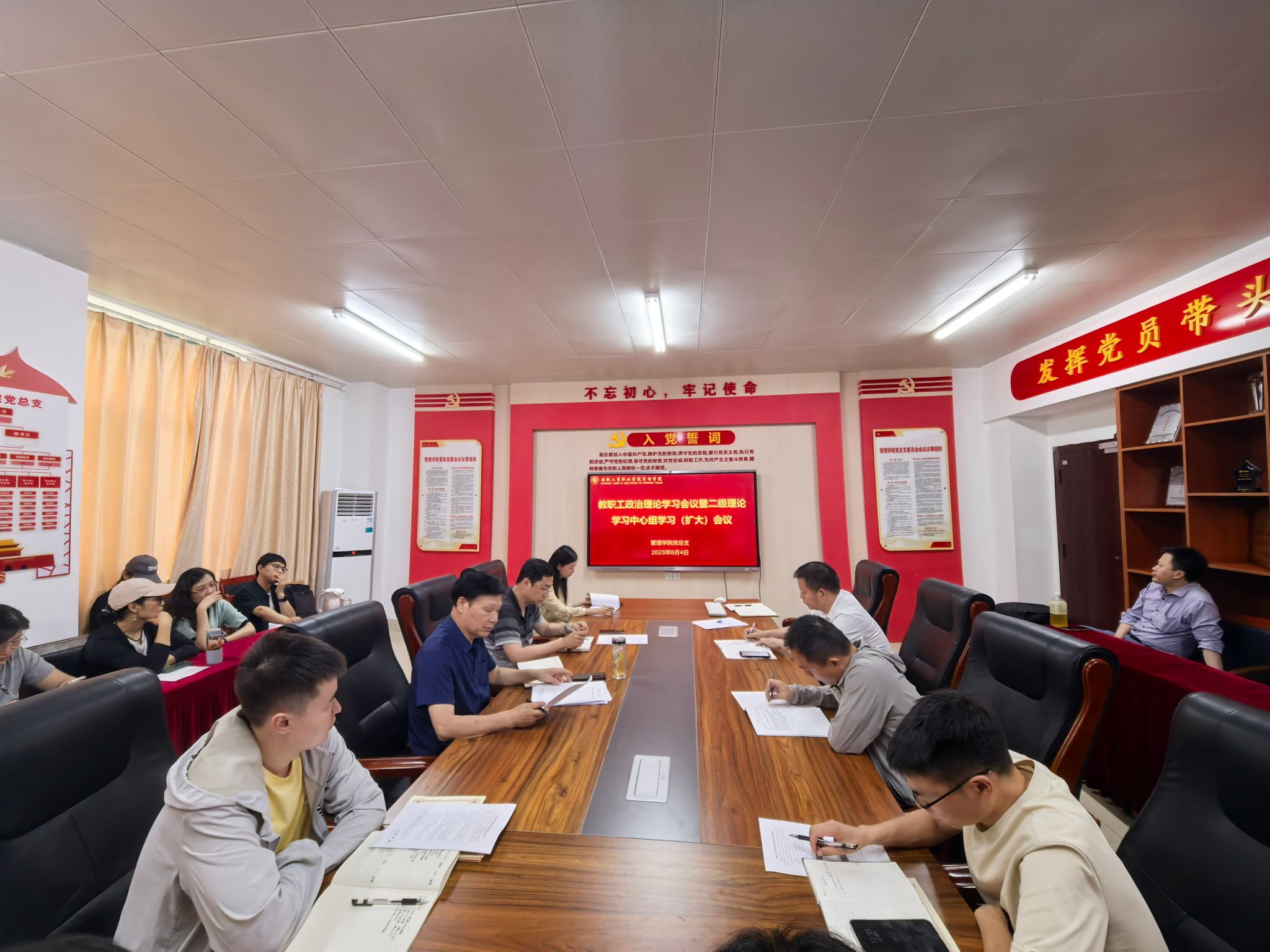 6月4日中午,管理学院党总支在学院党员活动室召开6月份教职工政治理论学习会议暨理论学习中心组学习(扩大)会议,重点学习习近平总书记关于深入贯彻中央八项规定精神学习教育的重要讲话和重要指示精神、习近平总书记关于教育的重要论述,开展深入贯彻中央八项规定精神学习教育警示,引导全体教职工进一步深化思想认识、明确责任担当、筑牢作风堤坝。学院党总支书记曹大友主持会议,学院党政领导班子成员、党总支委员及全体教职工参会。