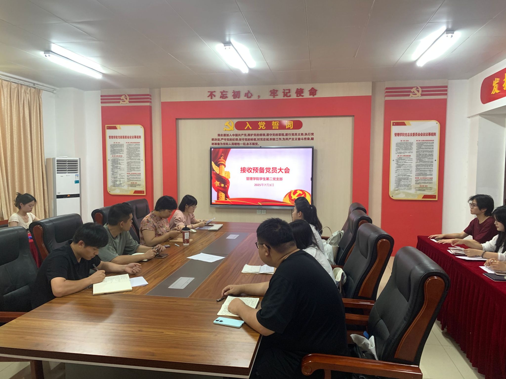 为进一步壮大学院党员队伍,提升党支部的战斗力和凝聚力,2025年7月3日,管理学院学生第二党支部在学院党员活动室召开预备党员发展暨预备党员转正大会。会议由学生第二党支部书记毕筱菁同志主持,支部全体师生党员参加。