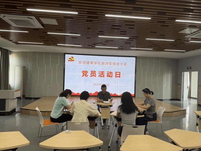 2025年7月14日下午,旅游管理教研室党支部于明德楼四楼VR实训室顺利开展了本月的主题党日活动。本次活动内容丰富,涵盖了政治理论学习与专业知识讲座两大板块,全体支部党员参加。