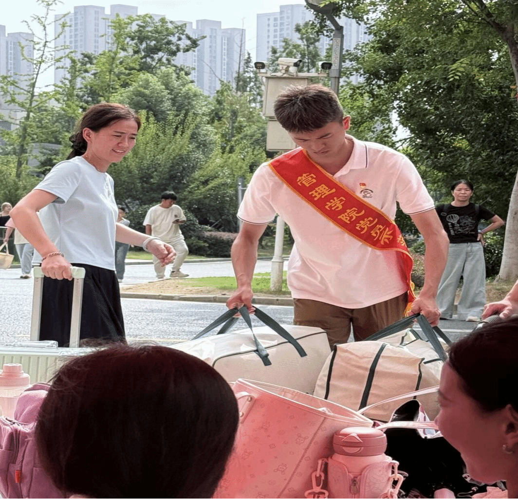亮身份,践初心,红色服务暖人心。12日一早,管理学院楼下党员先锋岗的旗帜早已高高飘扬。来自学院学生党支部的10余名本专科党员佩戴党员绶带集合完毕。按照既定工作安排,为2025级新生提供一对一的引导服务、帮助新生搬运行李、解答入学手续办理疑问、引导进入宿舍等。