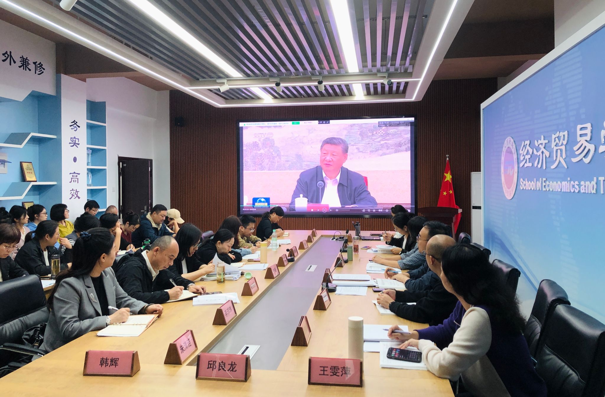 10月15日,经济贸易学院党总支在5楼教师能力提升中心召开教职工政治理论学习暨理论学习中心组学习(扩大)会议,会议传达学习习近平总书记在中共中央政治局第二十二次集体学习时的重要讲话精神、习近平总书记给全国特岗教师代表重要回信精神、习近平给天津大学全体师生的回信中的精神,学习《习近平谈治国理政》第五卷部分章节内容。会议由党总支副书记马莉主持,全体教职工参加会议。