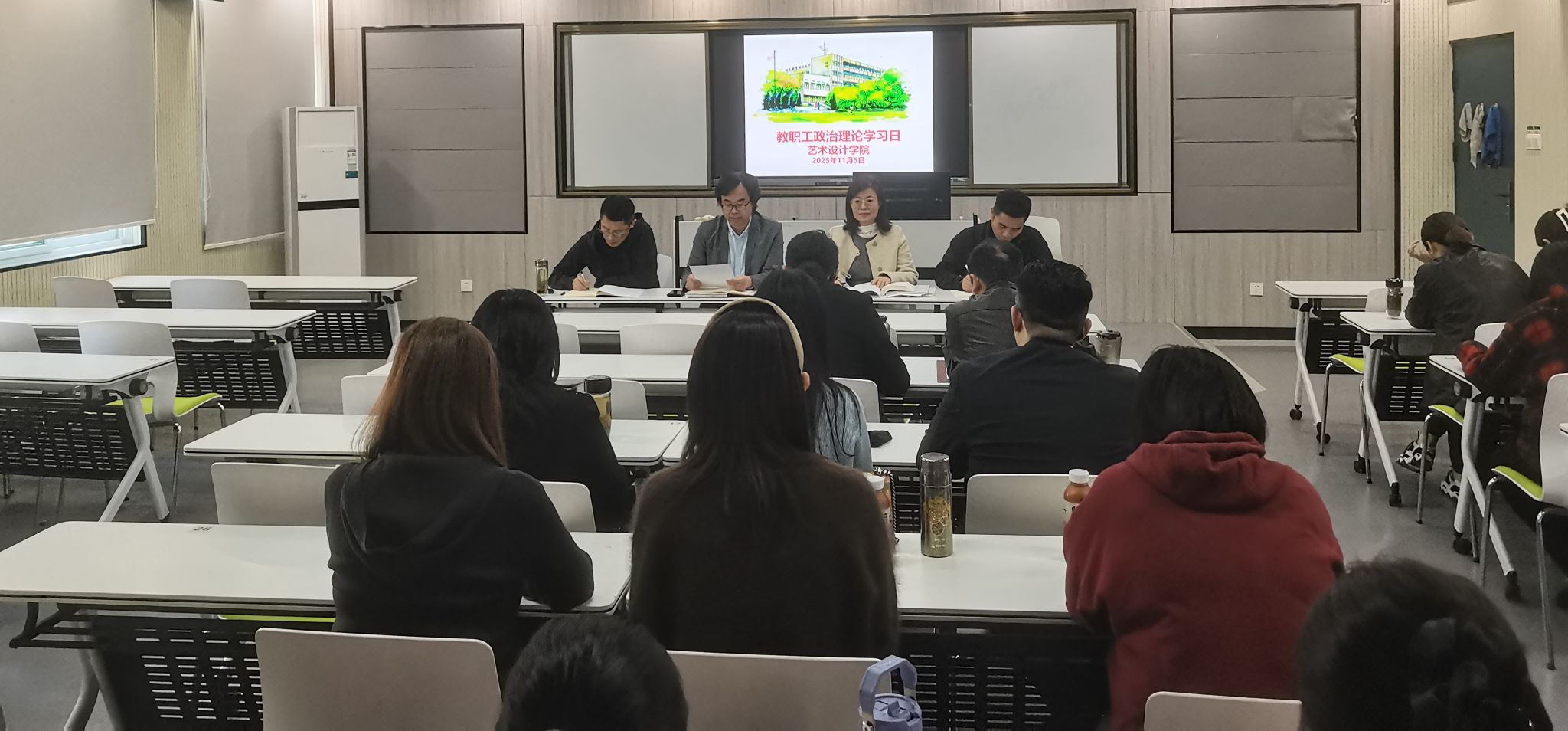 11月5日中午,艺术设计学院党总支在致知楼204智慧教室组织召开十一月份教职工政治理论学习会议,党委委员、党委宣传统战部部长、艺术设计学院党总支书记孔成,艺术设计学院党总支副书记、院长魏芬,副书记张乐,副院长邱志斌等全体教职工参加学习。