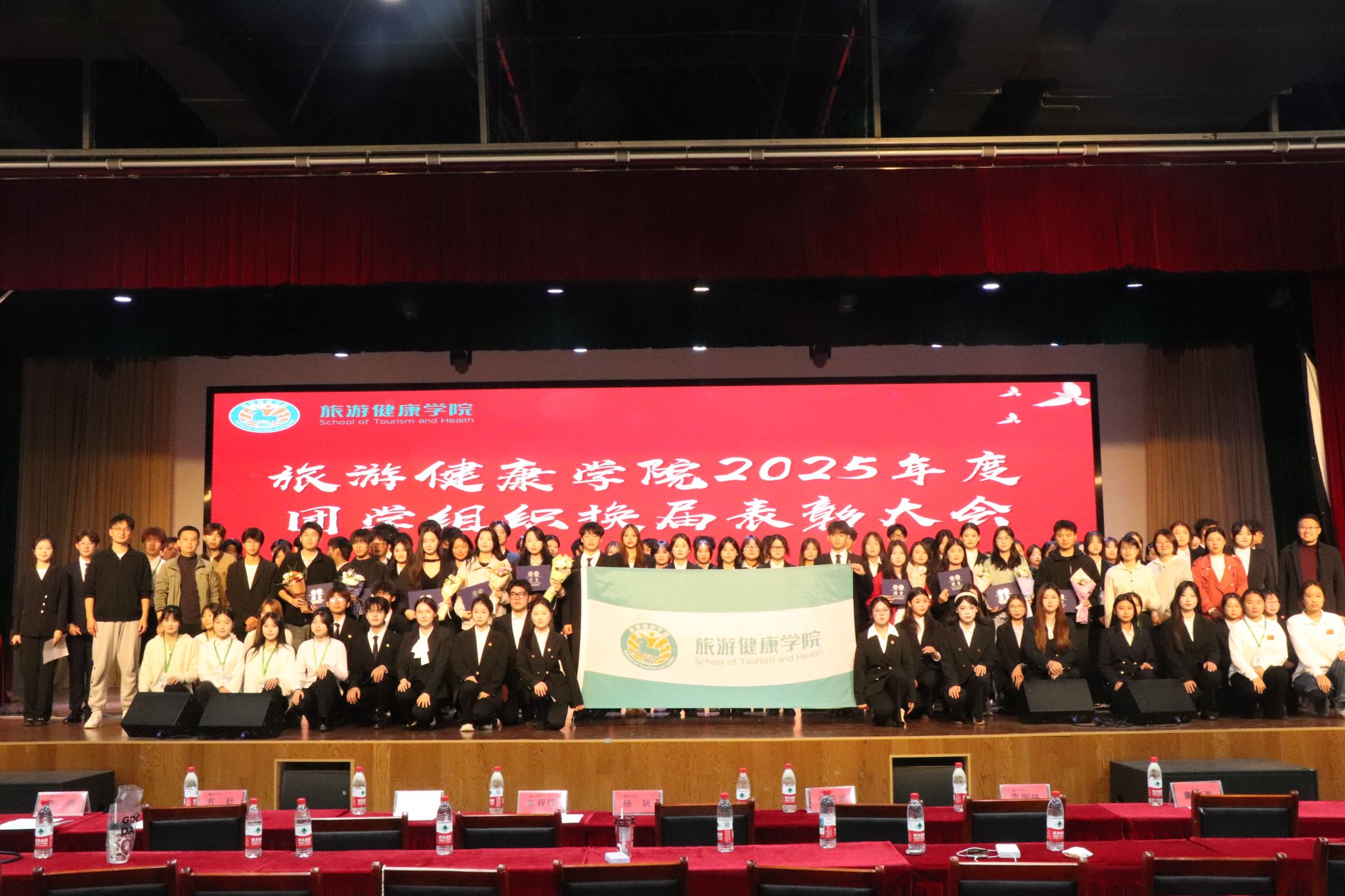 11月12日中午,旅游健康学院在大学生活动中心隆重召开2025年度团学组织换届表彰大会,总结过去一年团学工作成果,表彰先进集体与个人,并完成新一届团学组织骨干的聘任仪式。旅游健康学院党总支书记杨锐、组织员张程程、办公室主任孙群以及团学组织指导老师和辅导员代表出席大会。