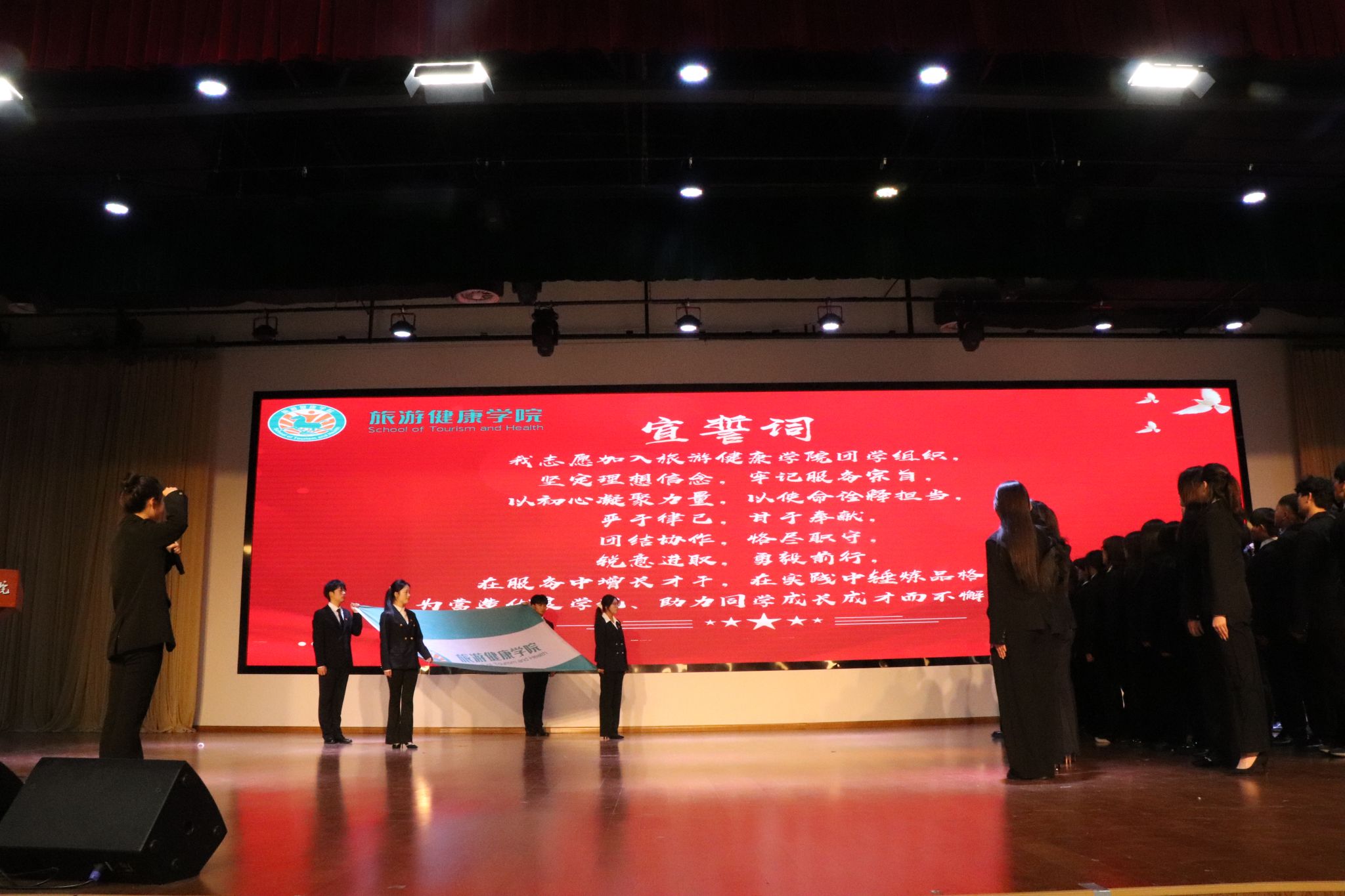 在换届环节,新一届团学组织骨干名单正式公布,学院老师为各级团学组织学生干部颁发了聘书和工作证。新一届团学组织学生干事为大家表演了手语舞《勇往直前》,传递了团学组织不怕困难、勇于拼搏、勇往直前的奋斗精神。最后,全体新任职团学组织学生干部整齐列队,高举右拳,面向院旗庄严宣誓,誓言声声,响彻会场,彰显了新一届干部的坚定信念与昂扬斗志。