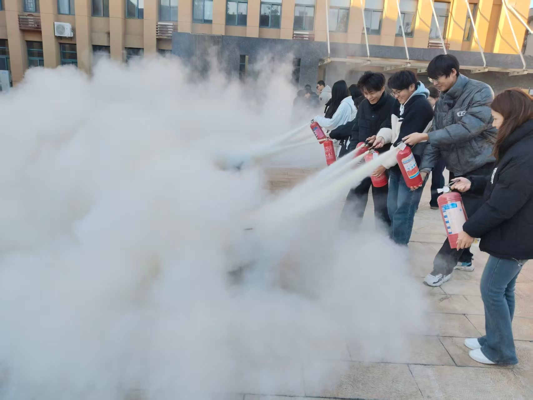 实操环节。消防员在致知楼广场现场示范了灭火器“提、拔、握、压”操作要领,并组织师生分组进行实操演练。大家踊跃参与,在消防员的指导下亲身体验灭火过程,切实掌握了基本灭火技能。此外,消防员还现场解答师生关于消防安全的疑问,进一步丰富了师生的消防知识储备。