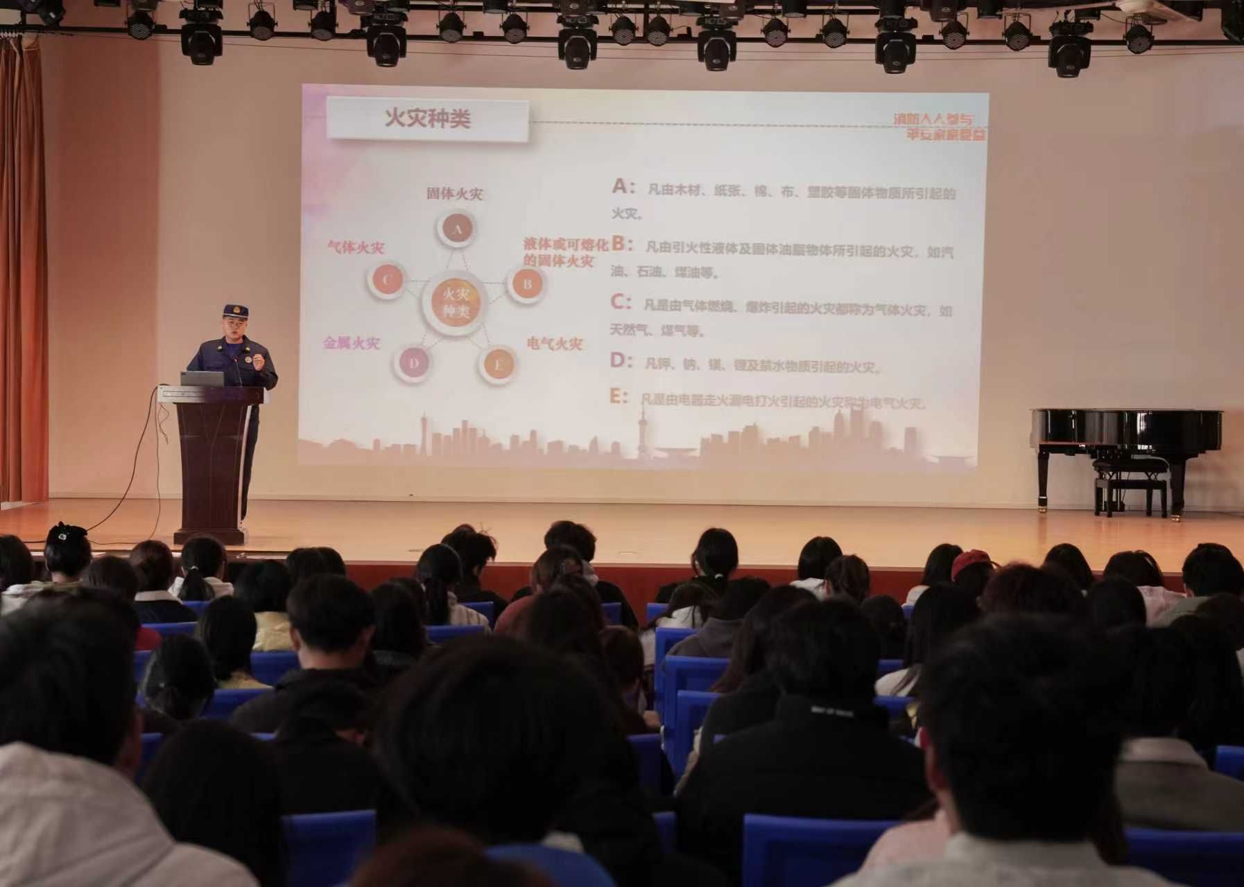 消防培训环节。杏花消防站消防员就火灾消防的基本概念、燃烧的基本条件、常见的火源、灭火的基本方法等分门别类地作了简短介绍。针对宿舍、食堂、办公和教学、图书馆、配电房等重点区域,就如何预防火灾,进行了详细的讲解。同时结合典型校园火灾案例,详细讲解了火灾的成因、初期火灾的扑救方法、火场逃生自救等。通过PPT演示、案例剖析等方式。并强调校园日常消防安全管理的重要性,引导师生们树立“预防为主,防消结合”的安全理念。