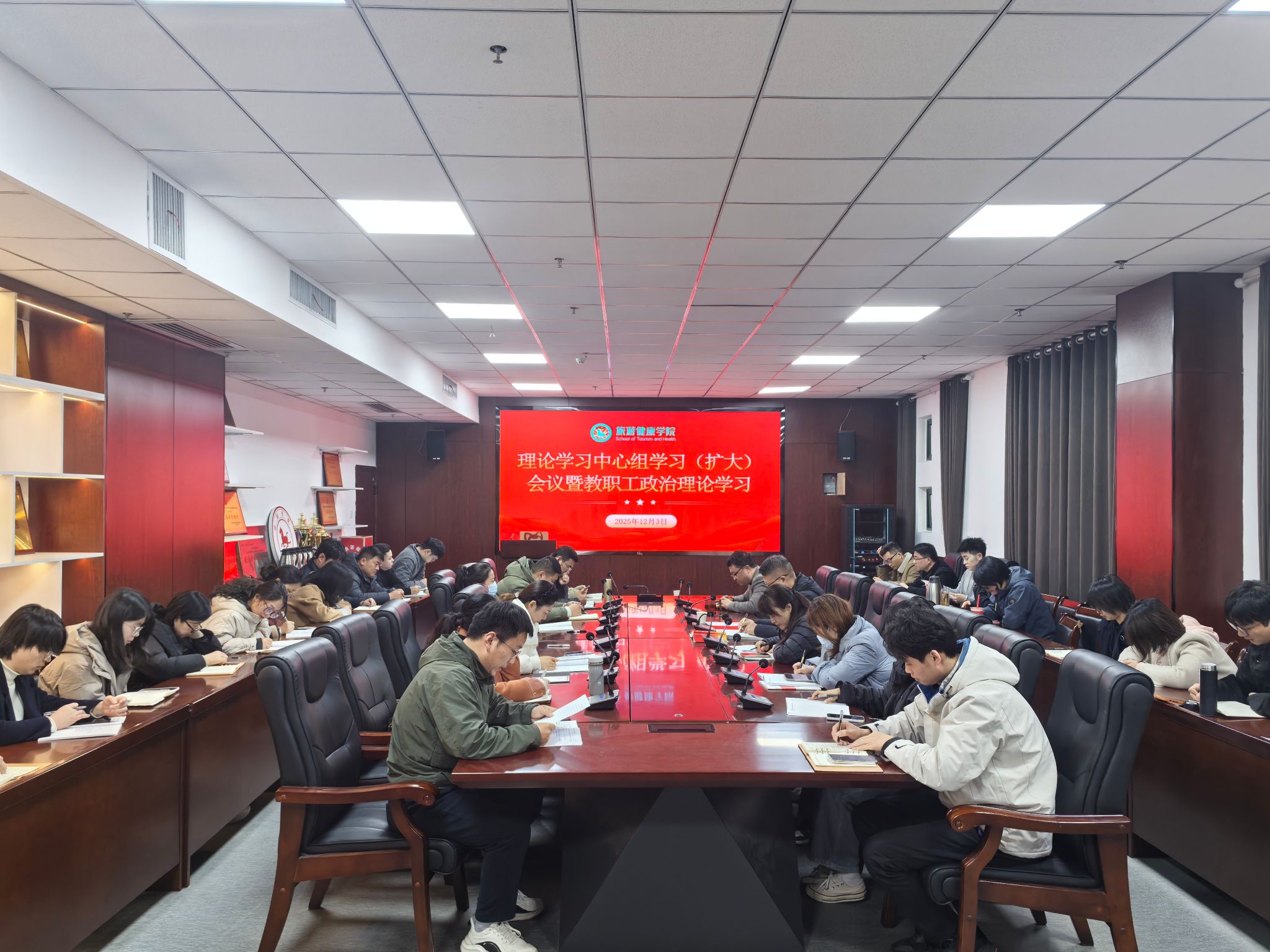 12月3日下午,旅游健康学院党总支在学院会议室召开二级中心组学习(扩大)会议暨教职工政治理论学习,会议由党总支书记杨锐主持,全体教职工参加会议。