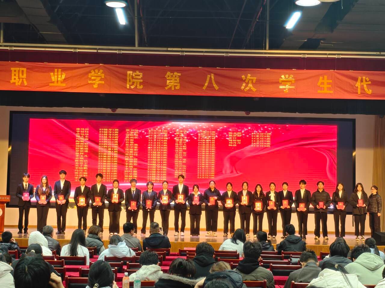 随后,23健身指导与管理2班孔可璐同学作为2025年度国家奖学金获奖代表发言,她回顾了自己入学以来的点点滴滴,分享了如何从最初的懵懂无知到如今自信自强,一路有欢声与笑语,有辛酸与泪水,她鼓励同学们努力就有回报,愿同学们都能不负自己最好的青春。24烹饪工艺与营养2班郝静怡同学作为世界技能大赛获奖代表发言,她回顾了自己参加技能大赛、学科竞赛、职业规划大赛等赛项的经历,分享了自己的心得与体会,她希望同学们钻研专业知识,提高专业技能,朝着大国工匠、能工巧匠的目标而努力奋斗。 24级旅游管理2班王丽君同学作为学校三好学生代表发言,她表示,大学生活是充满挑战和机遇的,在这里,我们不仅学到了丰富的专业知识,更在思想、能力和综合素质上得到了全方位的提升。每一次的课堂讨论、每一次的社团活动、每一次的志愿服务,都是我们成长的宝贵经历。