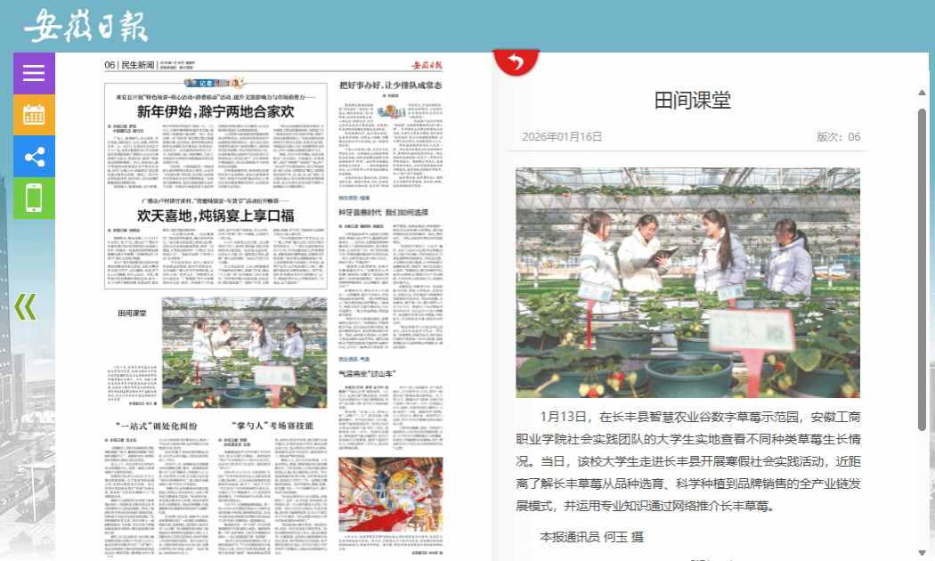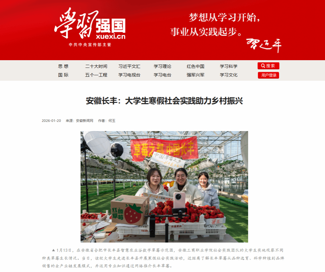 近日,学习强国、人民网、安徽日报等多家主流媒体集中报道了我校信息工程学院2026年寒假“返家乡”社会实践活动,引发社会关注。寒假期间,学院“数智助农·E路莓好”社会实践团队赴合肥市长丰县水湖镇,开展以“青春为中国式现代化挺膺担当”为主题的社会实践活动。团队深入长丰县智慧农业谷数字草莓示范园,系统调研草莓产业在品种选育、智慧种植及品牌营销等环节的全链条发展模式,充分发挥专业优势,运用新媒体新技术,通过网络平台积极推介长丰草莓,以青春力量助力家乡农业品牌建设与产业振兴。